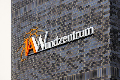 Zudem fertigten die Licht- und Werbemitteltechniker sowohl die zwei Logos des Wundzentrums als auch das der Wundex-Gruppe aus beleuchteten Einzelbuchstaben und montierten sie an die Fassade des Neubaus. An der Zufahrt wurde ein neuer Wegweiser-Pylon in edler Optik installiert, der in der L+W-Werkstatt am Geister Landweg hergestellt worden war.