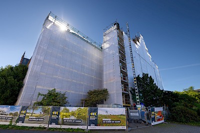 Auch das Einrüsten selbst war nicht ganz ohne. Da die Fassade des gut 130 Jahre alten Gebäudes aus der Neorenaissance unter Denkmalschutz steht, durften nur an bestimmten Punkten Bohrlöcher für die Verankerung eingebracht werden. Unter dem prüfenden Blick der zuständigen Denkmalbehörde wuchs das Gerüst von Etage zu Etage.