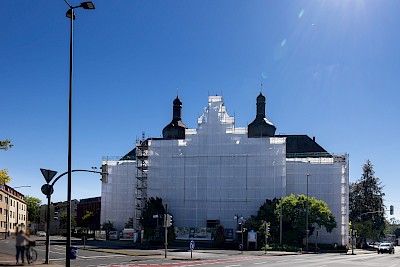Bis 2024 ist das Gerüst eine sichere Basis für alle Sanierungsarbeiten und wirkt aus einigen Perspektiven beinahe wie von Christo verpackt.