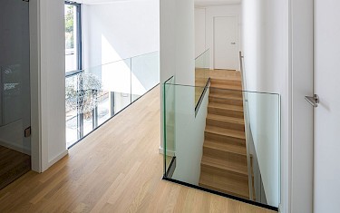 Im Erdgeschoss wurden verschiedene Bereiche durch Ganzglasanlagen, bestehend aus je einem festen Teil und einer Glastür, abgetrennt. Die u.a. so entstandene „Diele“ dient als Windfang, bleibt aber ein helles und offenes Entree. Im Obergeschoss bieten Glasbrüstungen eine solide Absturzsicherung und erhalten den großzügigen Charakter der Raumplanung ohne die Galerie blickdicht zu schließen.