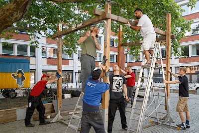 In der letzten Woche unterstützten die Brückinger das Projekt noch auf Handwerker-Art: Mitarbeiter verschiedener Betriebe der Firmengruppe Brück halfen beim Aufbau von Einfassung, Sitzgelegenheiten und Hängematten-Gerüst. Nebenbei bekam der Bauwagen der Spielzeugausgabe noch frische Farbe. Manchmal kann Handwerk eben doch ein Kinderspiel sein.