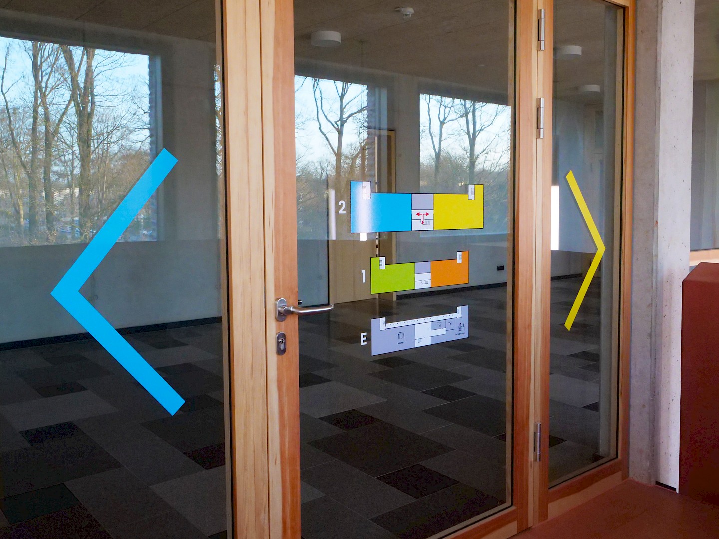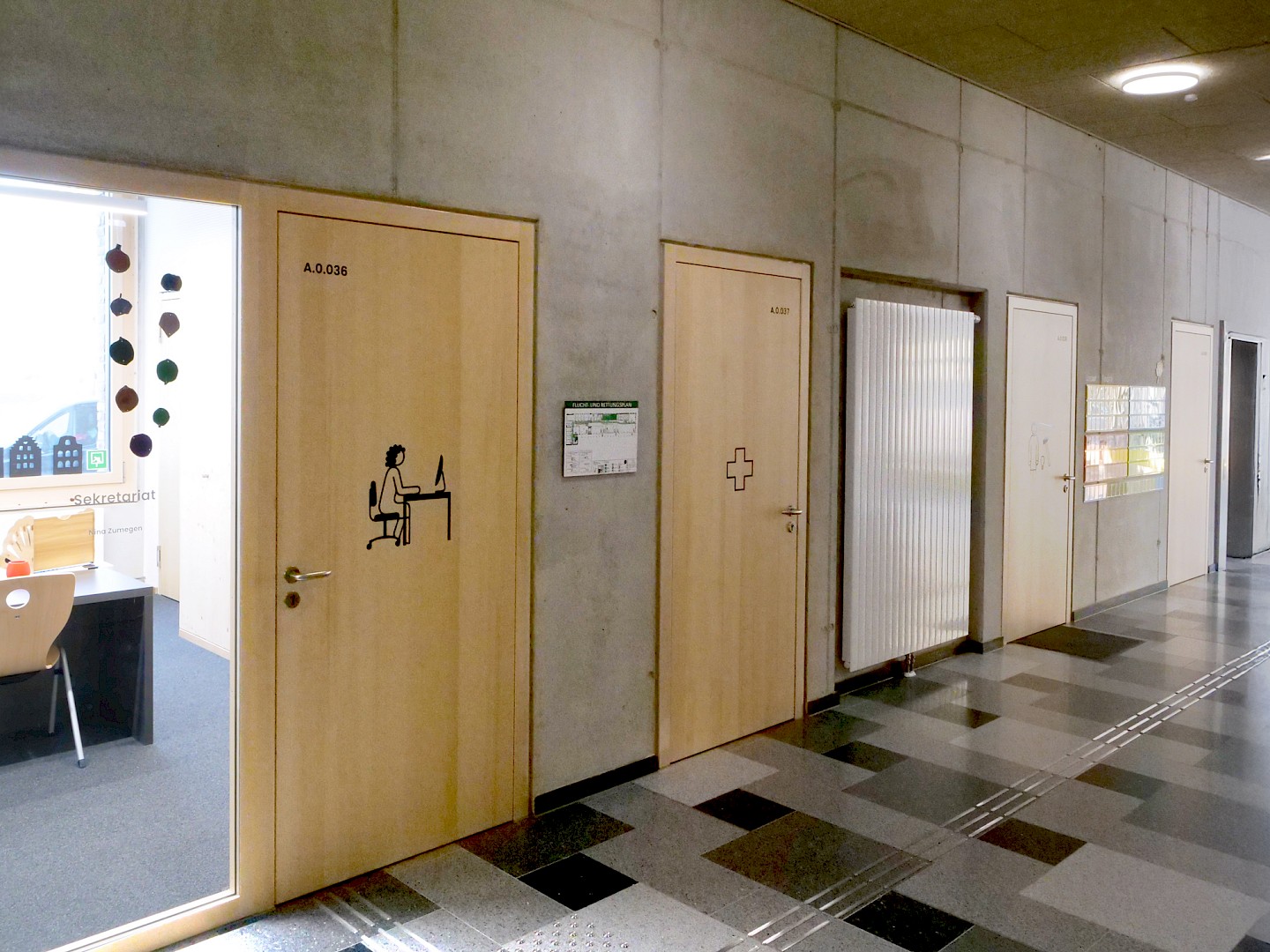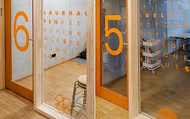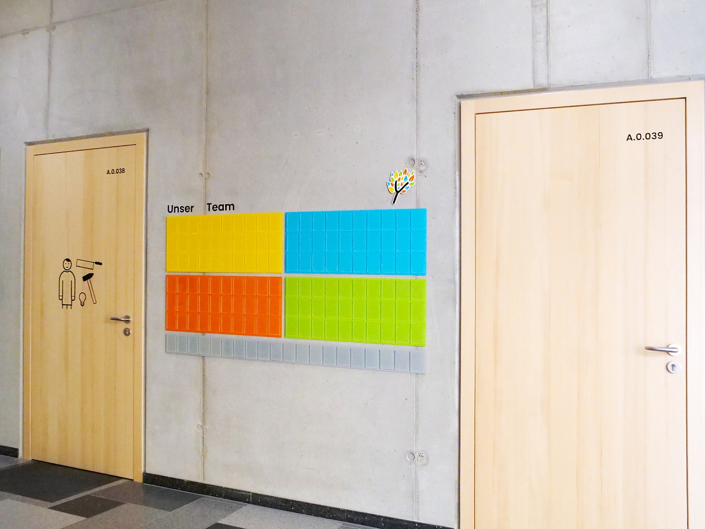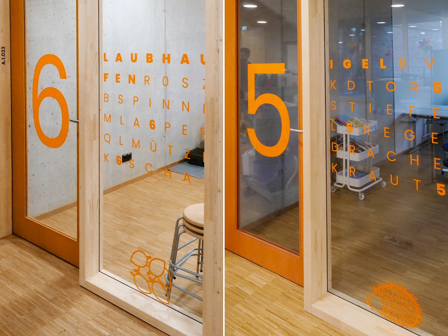 In einem ebenso komplexen wie konstruktiven Kreativprozess entstand eine Meta-Kommunikationsstruktur aus Farben und Symbolen. Vier Farbtöne gliedern das Gebäude in Cluster-Bereiche. Im Zusammenspiel mit Piktogrammen, großen Ziffern und Buchstaben können sich Kinder wie Erwachsene intuitiv orientieren.