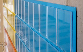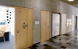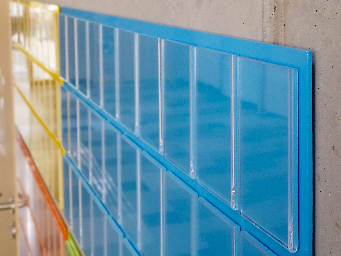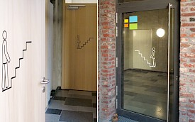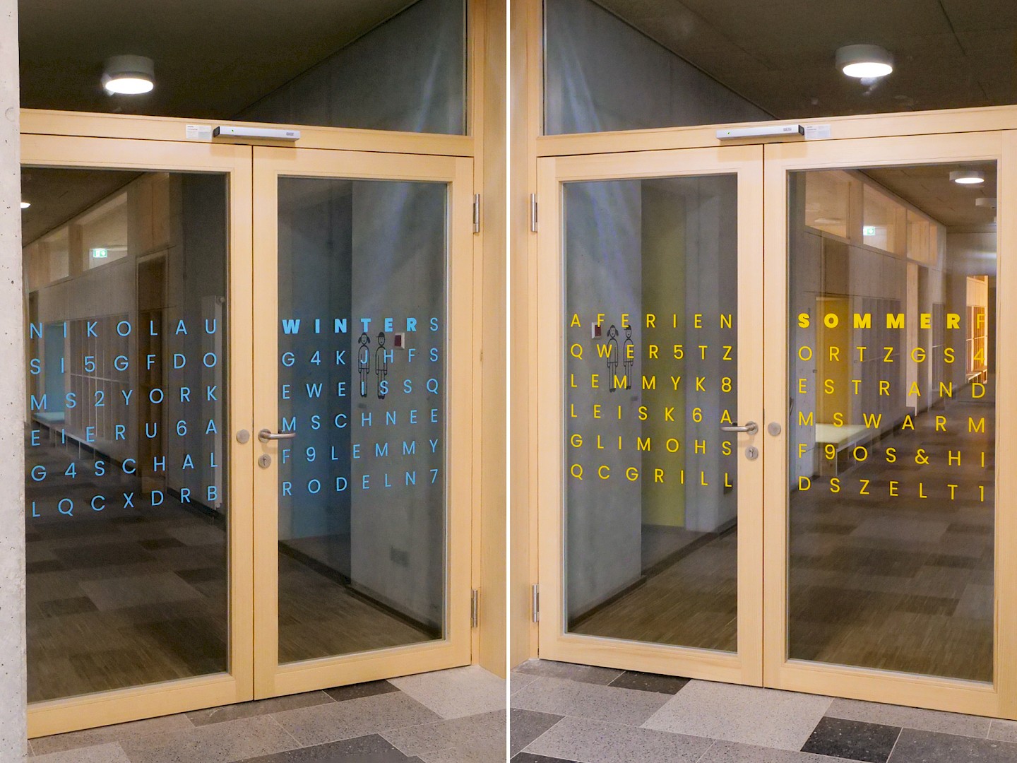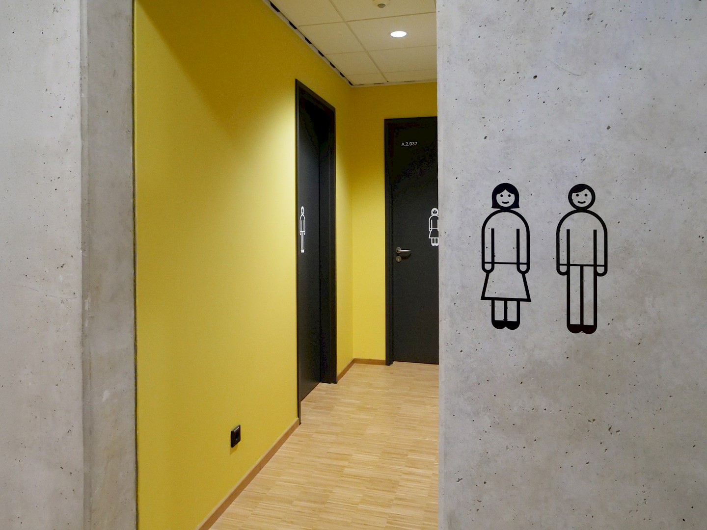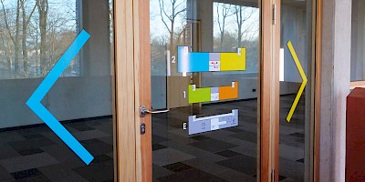 In einem ebenso komplexen wie konstruktiven Kreativprozess entstand eine Meta-Kommunikationsstruktur aus Farben und Symbolen. Vier Farbtöne gliedern das Gebäude in Cluster-Bereiche. Im Zusammenspiel mit Piktogrammen, großen Ziffern und Buchstaben können sich Kinder wie Erwachsene intuitiv orientieren.