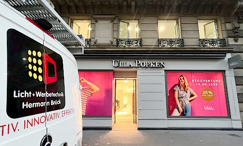 In die Nähe von Eiffelturm, Triumphbogen und Louvre im Herzen von Paris – genau dahin verschlug es das Team von Licht + Werbetechnik Hermann Brück im Rahmen eines Auftrags für Ulla Popken. Die Modekette mit Sitz im niedersächsischen Rastede betreibt rund 600 Filialen in ganz Europa.