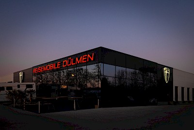 In einer ehemaligen Fabrik machte der leidenschaftliche Camper Juri Boltov sein Hobby zum Beruf und gründete die Reisemobile Dülmen GmbH. 2019 entstand eine moderne Ausstellungshalle mit Werkstattservice und Außengelände mit Palmenstrand-Flair. Nun erforderte eine bauliche Werbemaßnahme die Anreise der Brückinger.