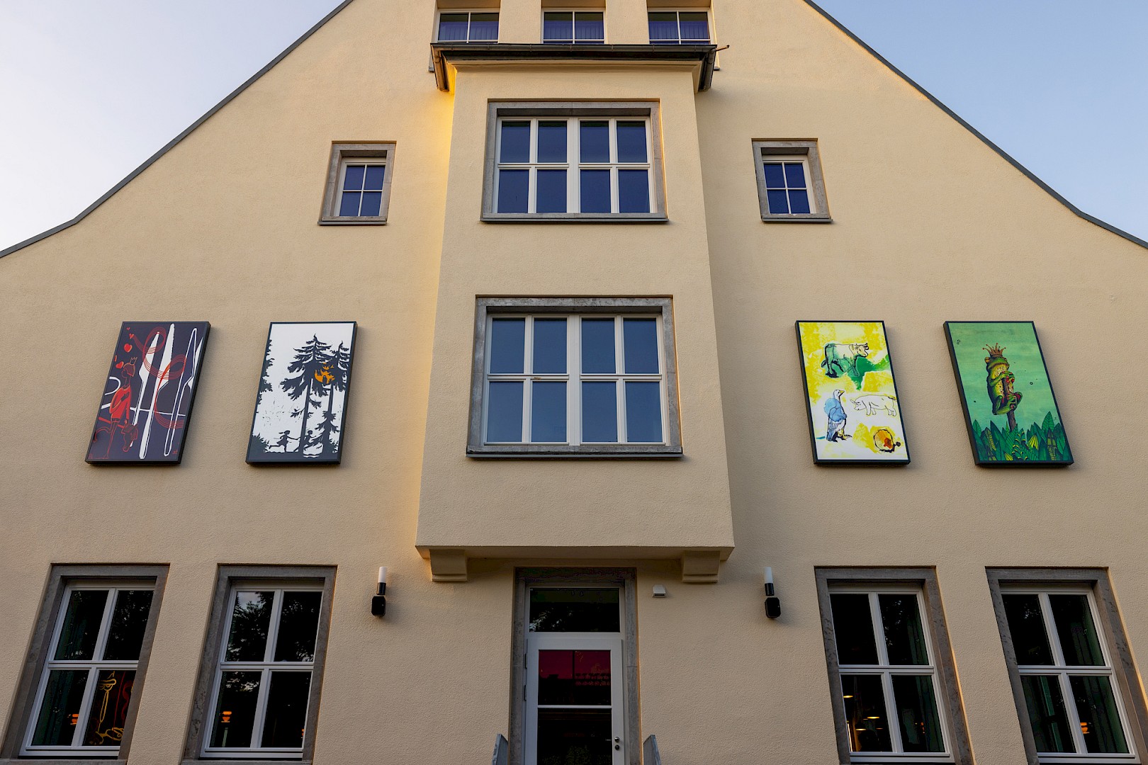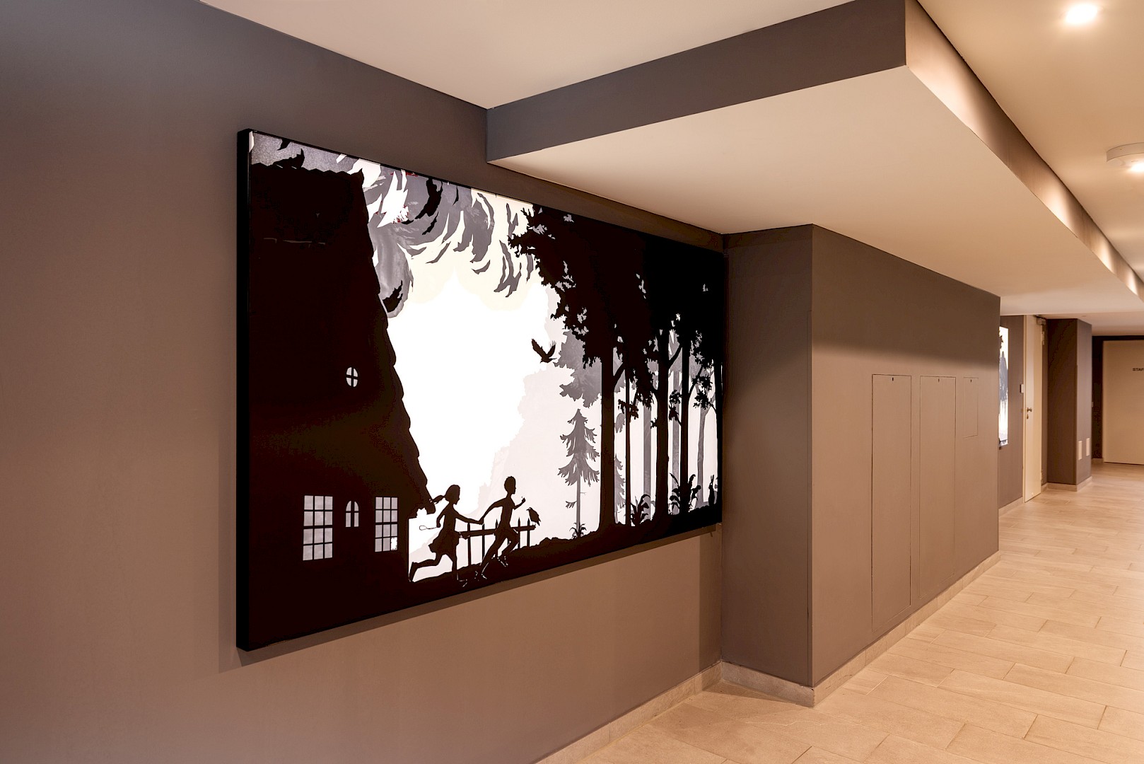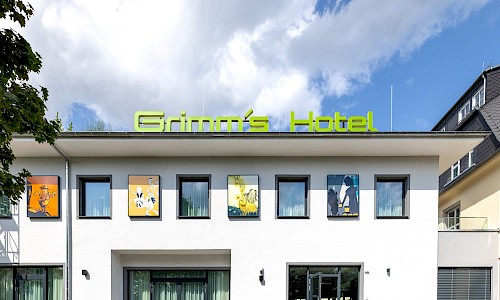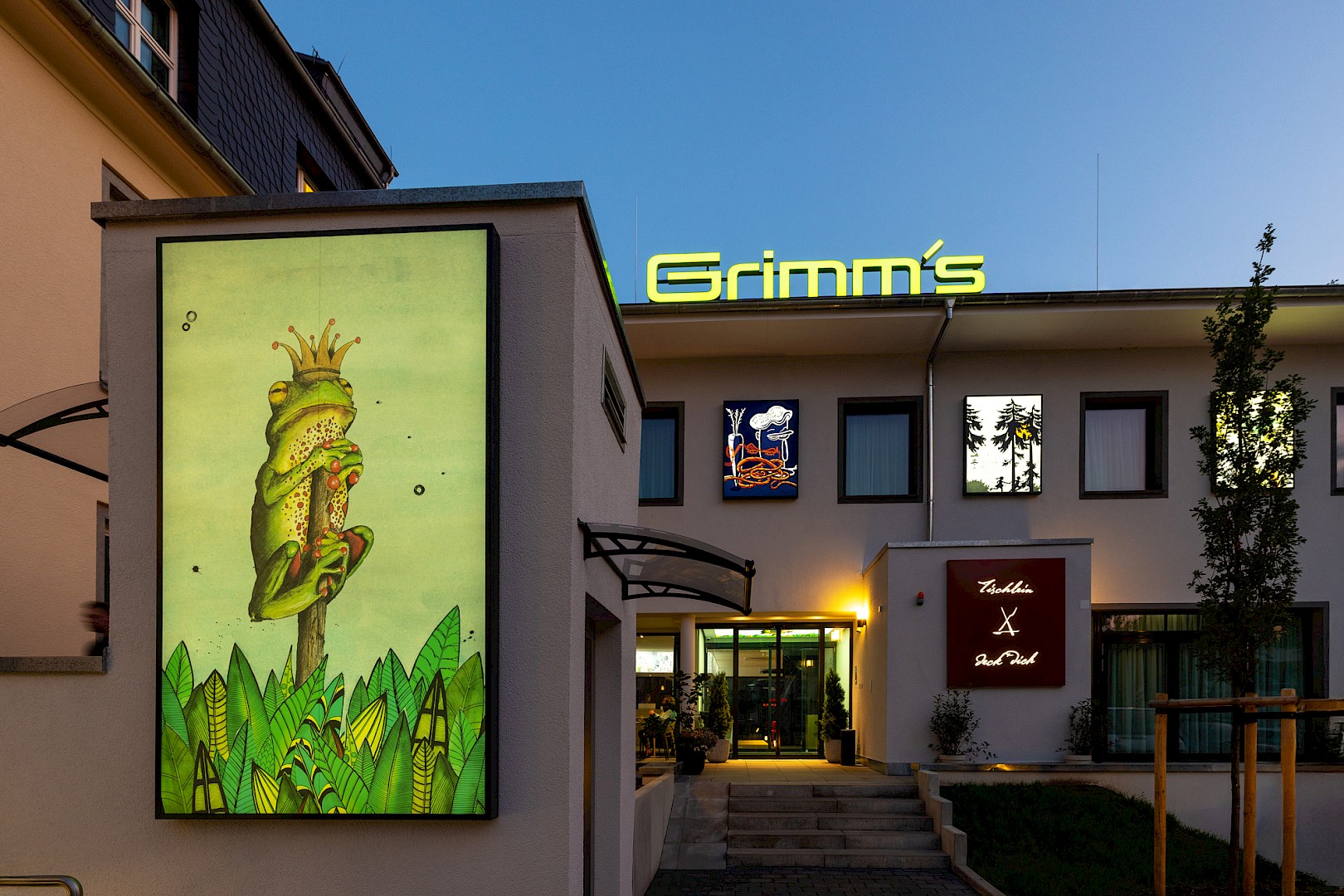 Auf dem Dach installierten die Brückinger zwei große LED-Einzelbuchstaben-Anlagen, welche bei Nacht in strahlendem Grün erleuchten. Die Fassaden zieren beleuchtete Lichtfelder mit Märchenmotiven. Am Empfang werden die Gäste nicht nur durch die Mitarbeitenden, sondern auch von einem illustrativen Spanntuch-Lichtfeld über der Rezeption begrüßt.