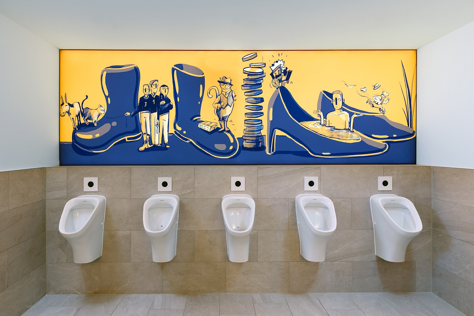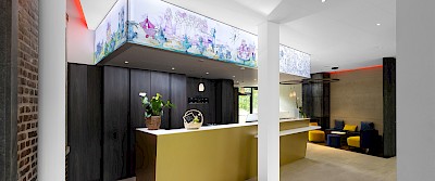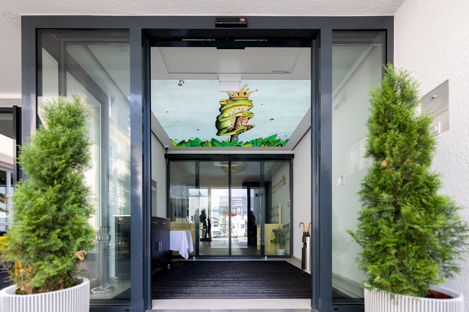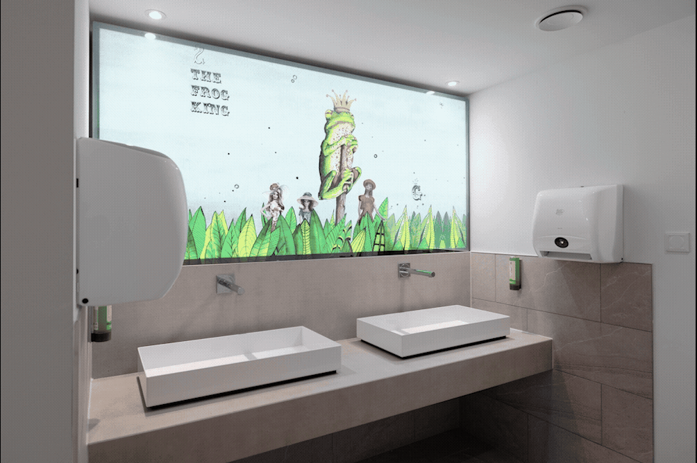 Eine weitere Besonderheit erhielten die allgemein nutzbaren WC-Räumlichkeiten im Untergeschoss des Hotels. An Stelle eines Spiegels erwartet einen über dem Waschtisch ein großer Leuchtkasten mit einer hell erleuchteten Froschkönig-Illustration. Das Highlight: Beim Herantreten der Gäste an den Waschtisch sorgt ein unsichtbar montierter Bewegungsmelder dafür, dass das Licht für kurze Zeit erlischt, das Motiv verschwindet und die Oberfläche zum Spiegel wird. Glas Theißing unterstützte hierbei zuverlässig mit der Lieferung des sogenannten Spion-Glases. Auch Damen- und Herren-WC sowie die Flurwände im Untergeschoss erhielten farbige Spanntuch-Leuchtkästen.
