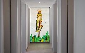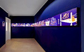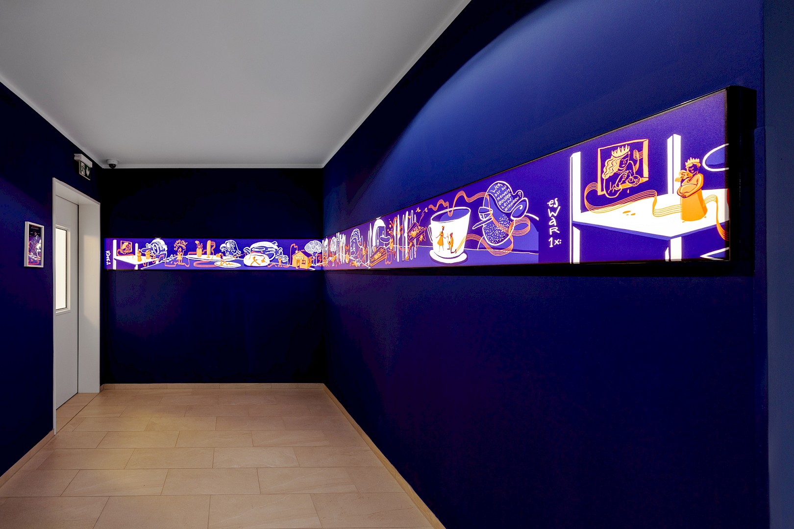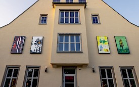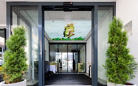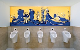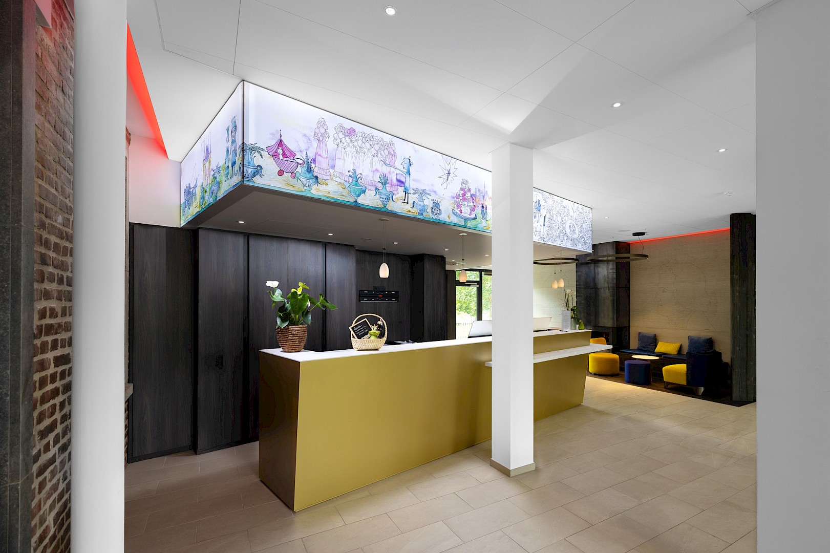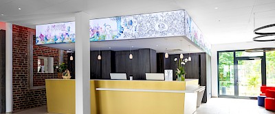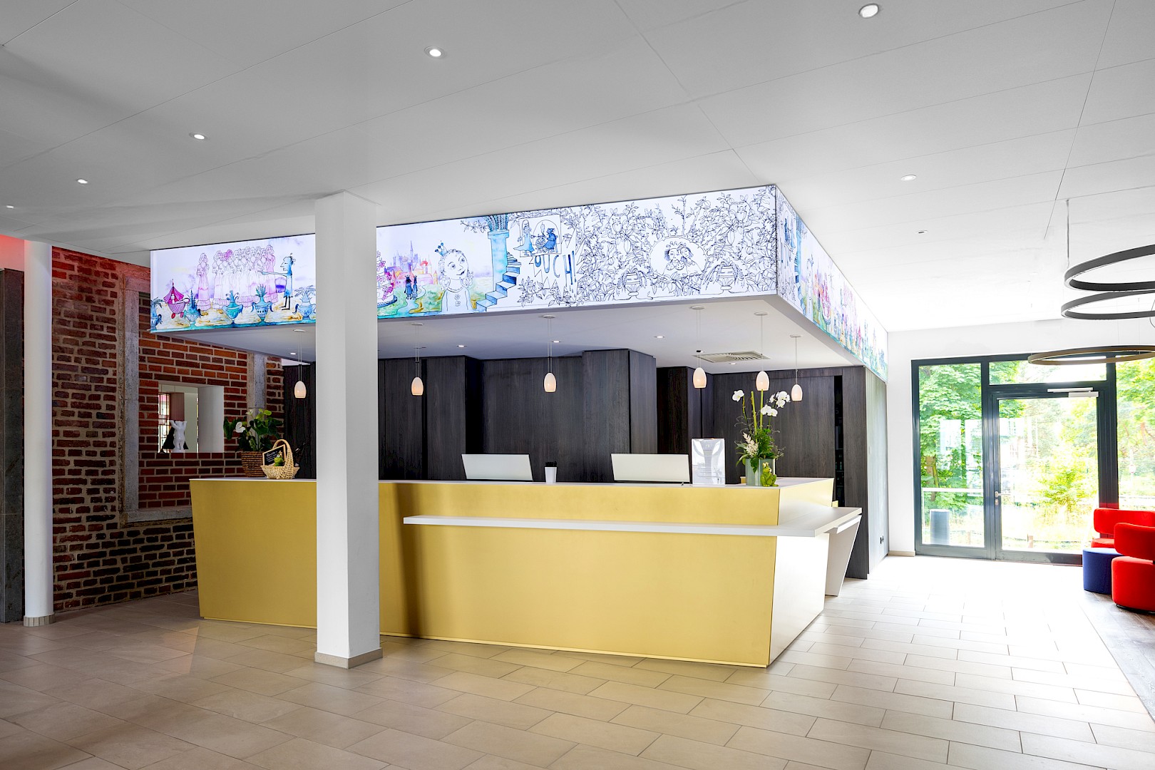 Eine weitere Besonderheit erhielten die allgemein nutzbaren WC-Räumlichkeiten im Untergeschoss des Hotels. An Stelle eines Spiegels erwartet einen über dem Waschtisch ein großer Leuchtkasten mit einer hell erleuchteten Froschkönig-Illustration. Das Highlight: Beim Herantreten der Gäste an den Waschtisch sorgt ein unsichtbar montierter Bewegungsmelder dafür, dass das Licht für kurze Zeit erlischt, das Motiv verschwindet und die Oberfläche zum Spiegel wird. Glas Theißing unterstützte hierbei zuverlässig mit der Lieferung des sogenannten Spion-Glases. Auch Damen- und Herren-WC sowie die Flurwände im Untergeschoss erhielten farbige Spanntuch-Leuchtkästen.