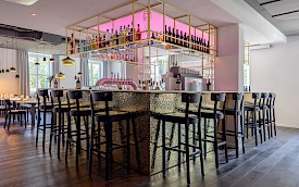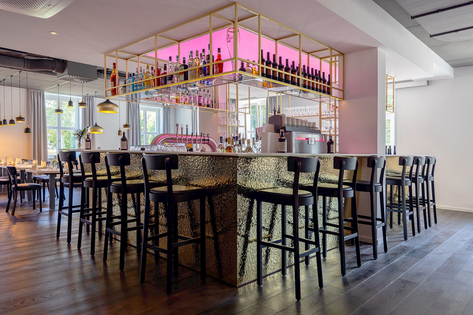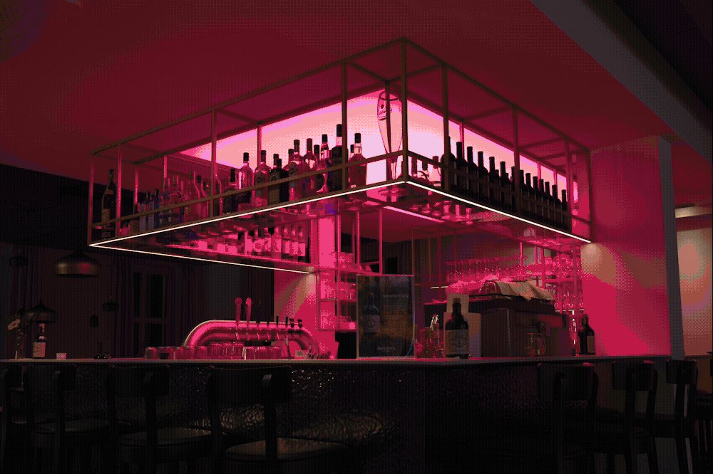 Etwas knifflig wurde es im Windfang und über der Bar – hier galt es in enger Abstimmung mit den Trockenbauern Leuchtfelder an der Decke zu montieren. Im Windfang erstrahlt der Froschkönig, das Spanntuch über der Bar blieb äußerlich weiß. Es lässt sich dimmen und durch RGBW-LEDs über ein Tablet farblich verändern. So kann die Bar je nach Event in unterschiedliches Licht getaucht werden.