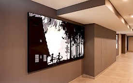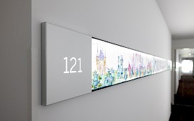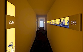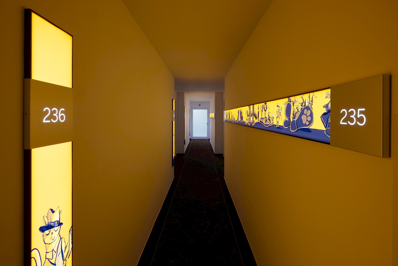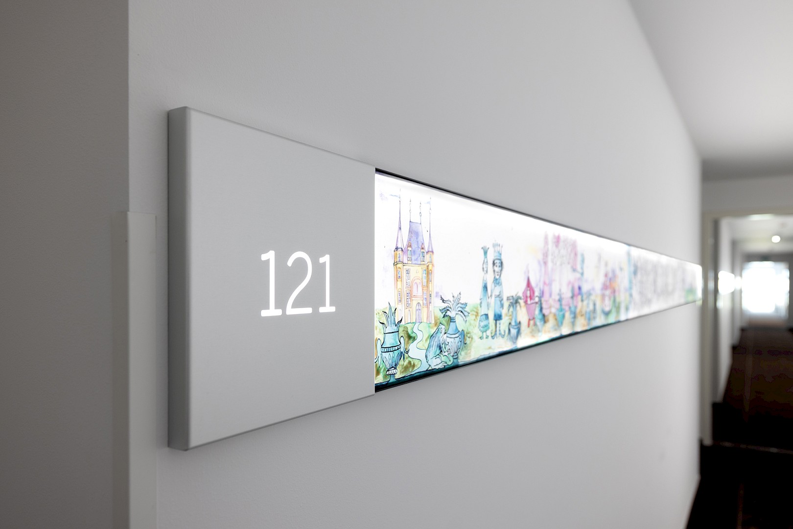 Weiter ging es in den Fluren der insgesamt vier Etagen des Hotels: Neben den Zimmertüren erstrecken sich waagerechte und senkrechte Lichtfriese, ebenfalls versehen mit unterschiedlichen Illustrationen. Durch die enge Abstimmung mit den anderen Gewerken konnte die Verkabelung unsichtbar installiert werden. Auch die Verschraubungen sind gut versteckt. Der Clou: Jeder Lichtfries erhielt ein gekantetes, dekupiertes Aluminiumblech mit der jeweiligen, durchscheinenden Zimmernummer. Die Technik wurde hierbei wartungsfreundlich installiert.