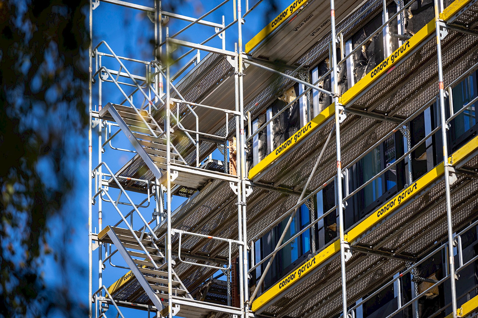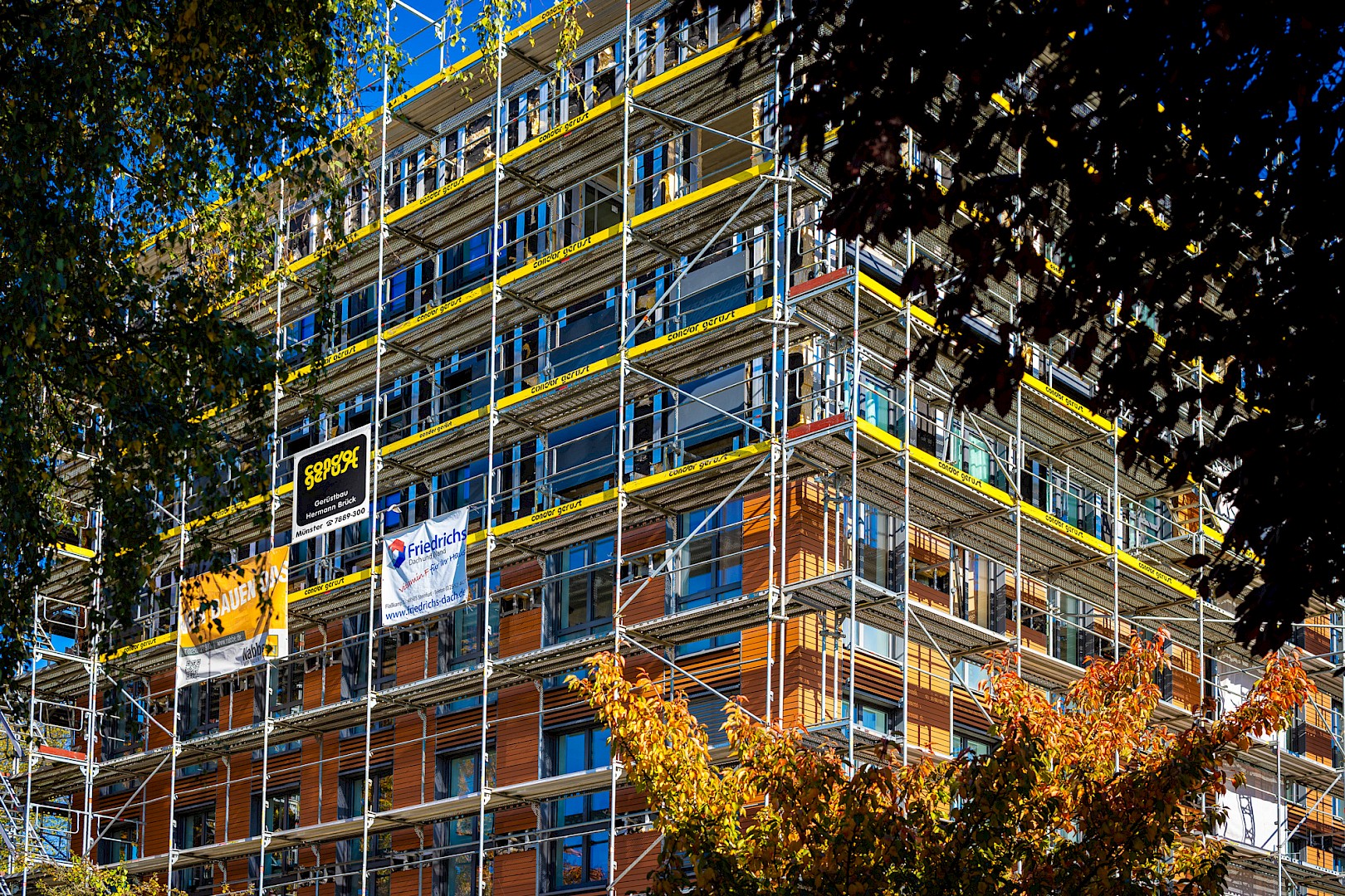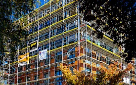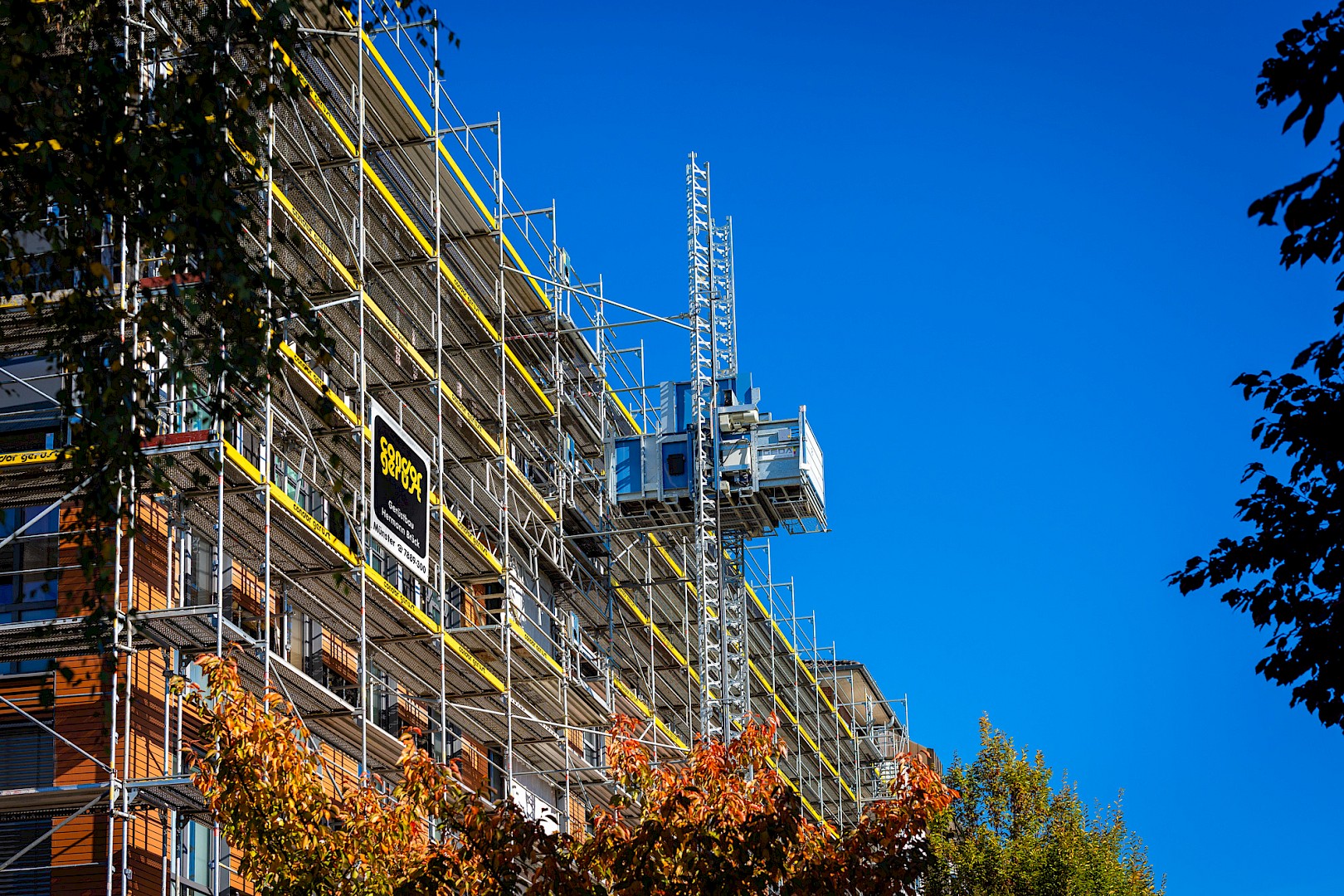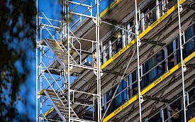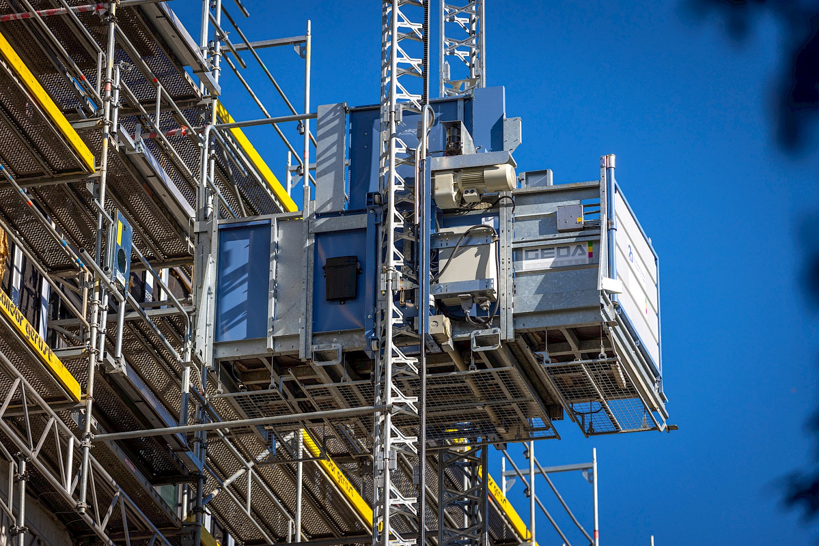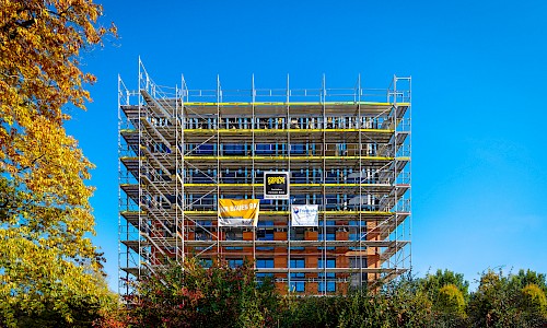 10 Gerüstlagen, 2.800 m² Fassadenfläche, ein 1,5t-Lastenaufzug: Es war schon eine Menge Material, das die Brückinger nach Hiltrup bringen mussten. Bei 20 Metern Dachkantenhöhe ist natürlich die Sicherheit von Patienten und Passanten ein Top-Thema.