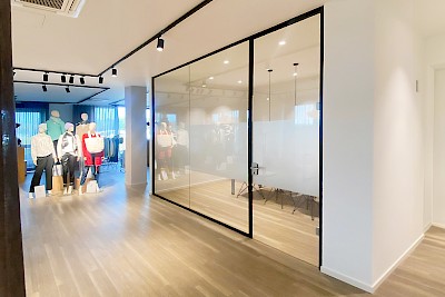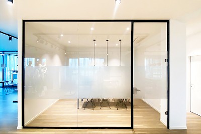 Das Ergebnis fügt sich harmonisch in die Innenarchitektur der Büros ein. Der zeitlose Klassiker Glas wirkt elegant und hält die Geräuschkulisse zuverlässig draußen. Damit auch indiskrete Blicke draußen bleiben, folierte das Theißing-Team die Front mit einem Sichtschutzstreifen in Milchglasoptik.