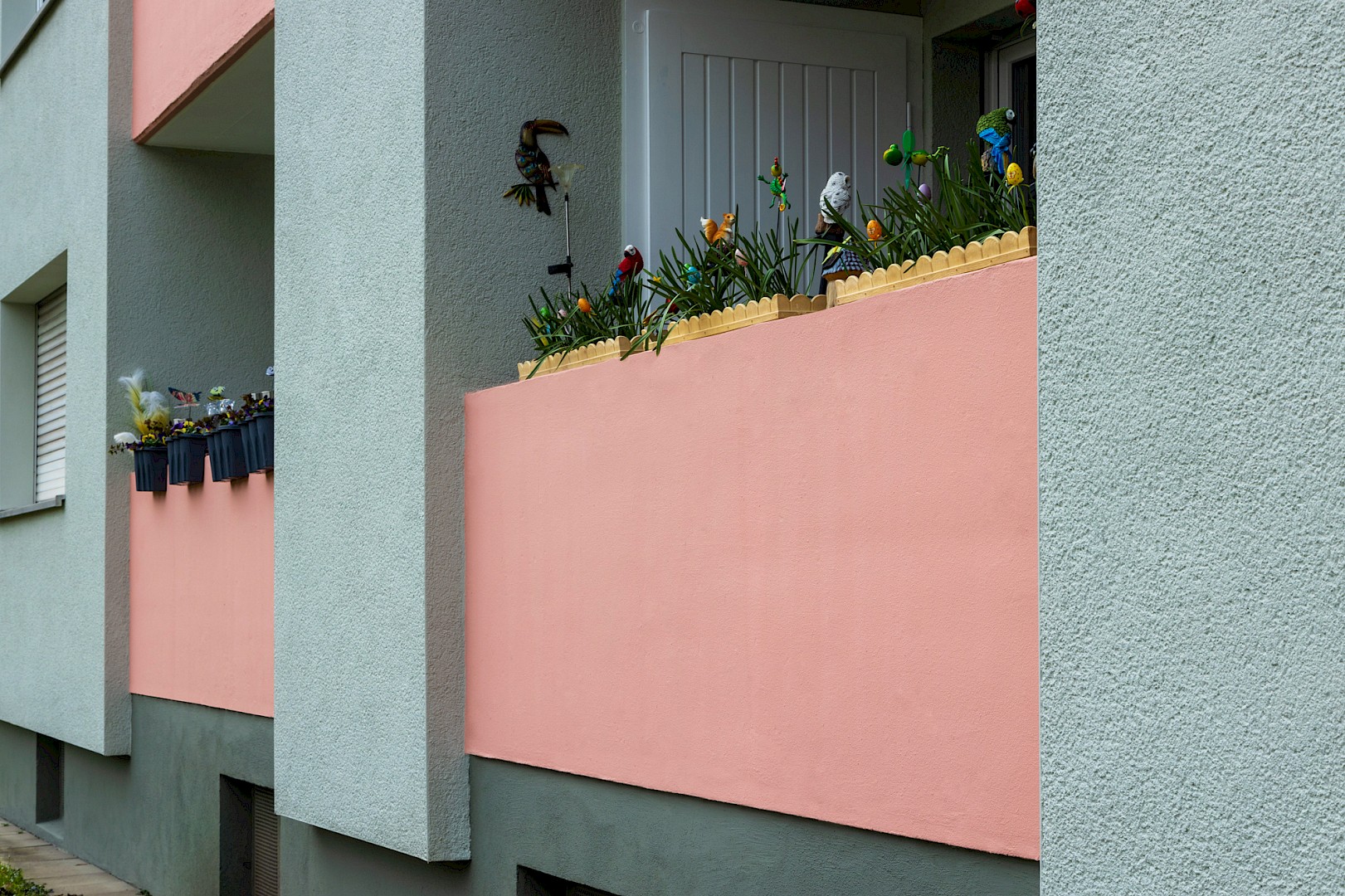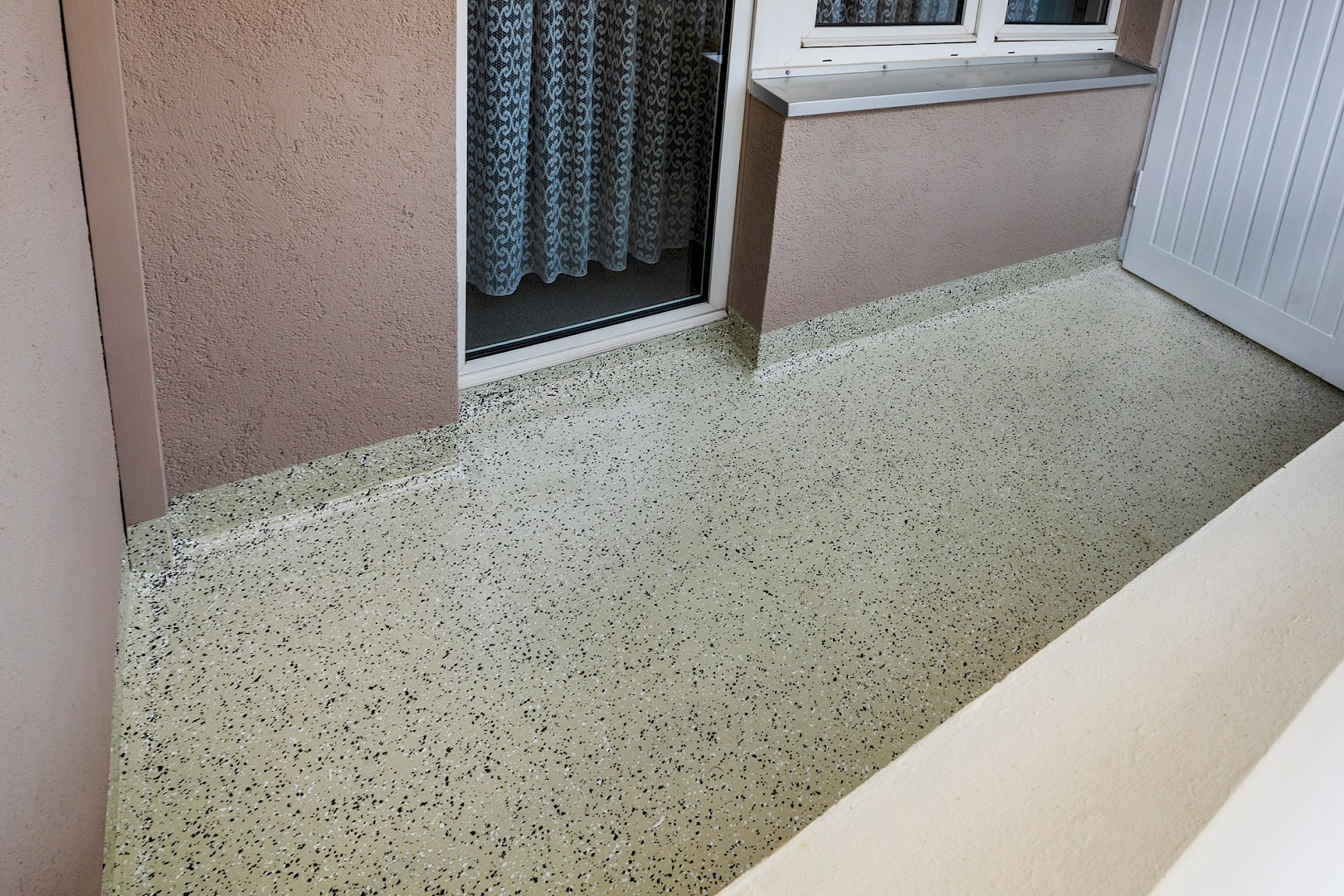 In Essen-Gerschede versah das Team die Balkone nach einer Oberflächensanierung mit einer neuen Boden- und Sockelbeschichtung, die Regenwasser absorbiert und ableitet.