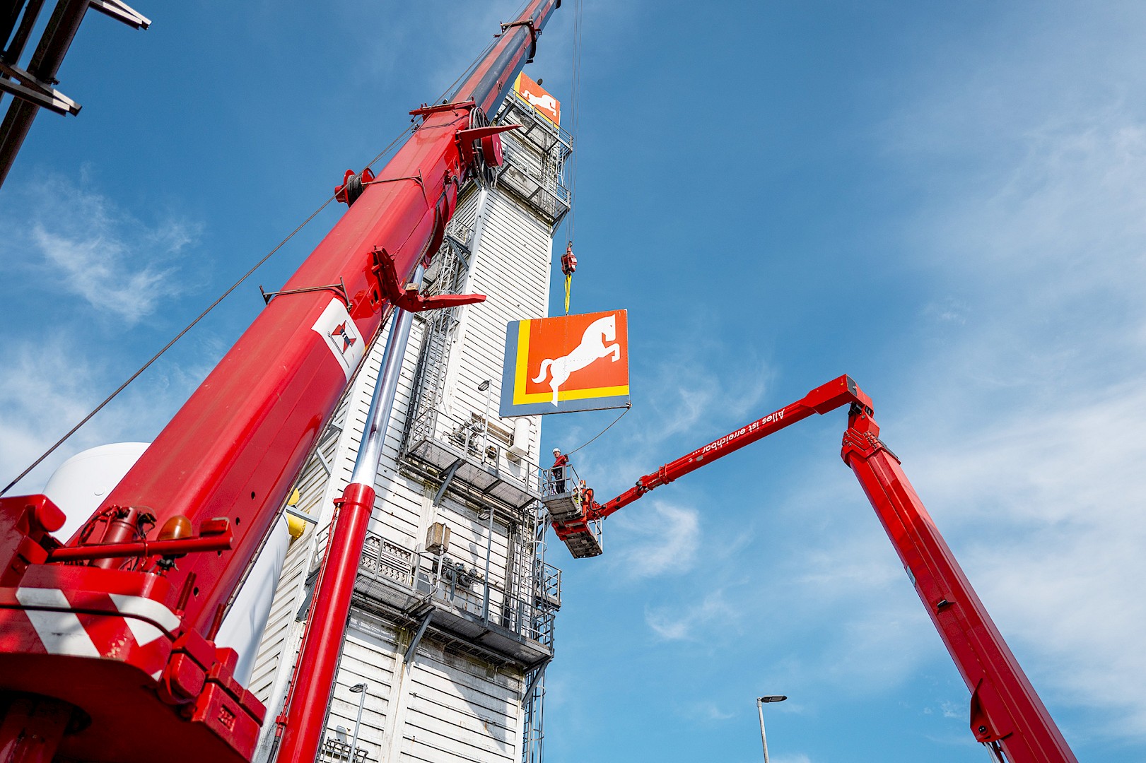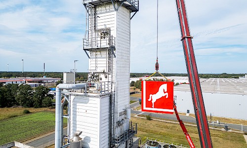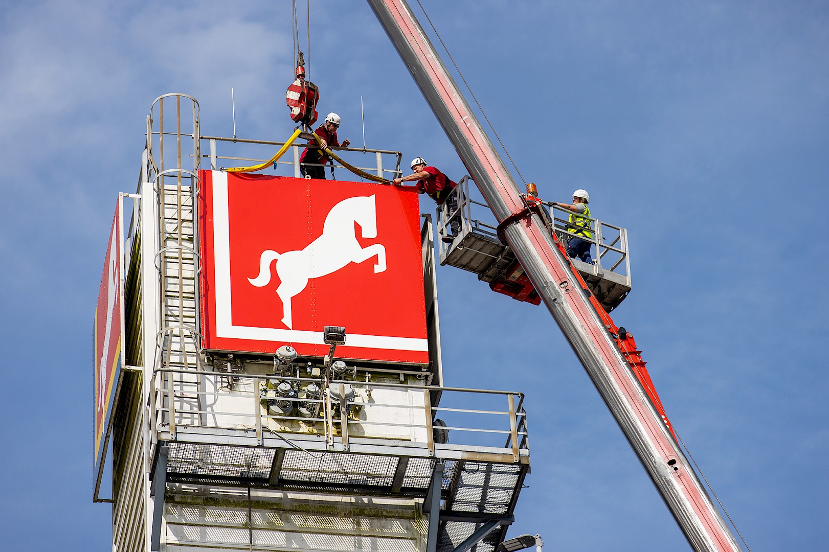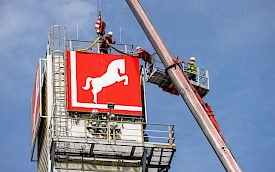Das steigende Westfalen-Ross wurde im Zuge eines Relaunchs modifiziert. Darum sollte das L+W-Team die Signets von dreieinhalb Metern im Quadrat durch die neue Version ersetzen.