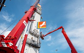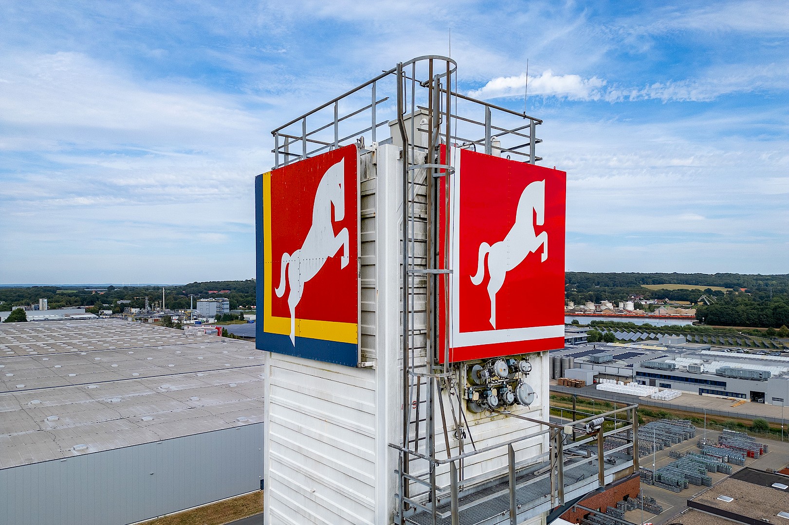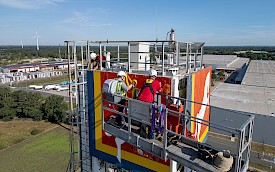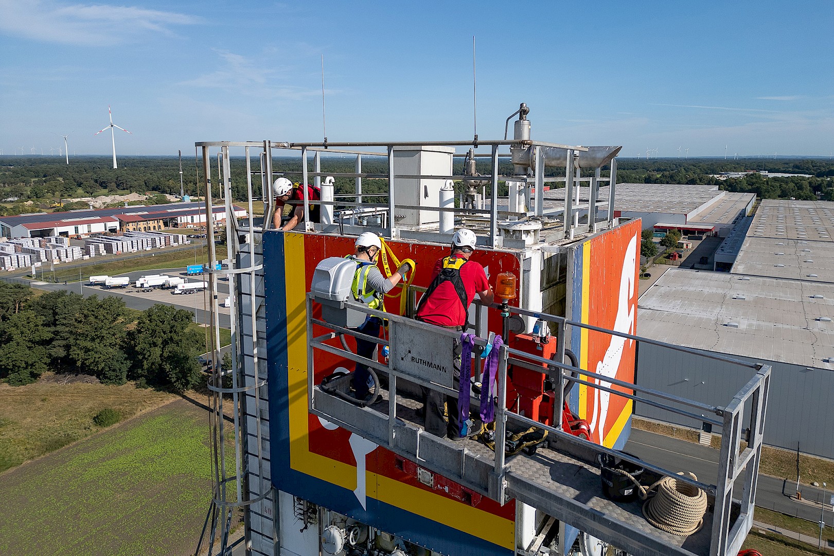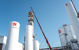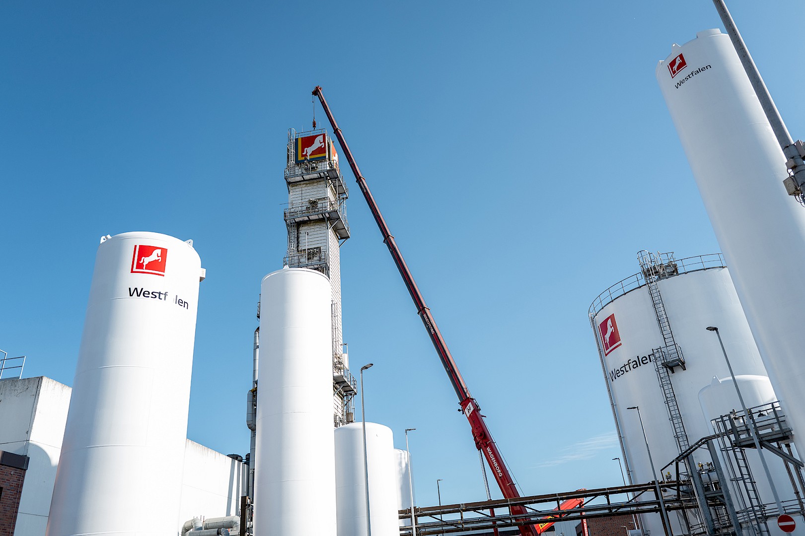 Für die Westfalen AG sind die Brückinger regelmäßig im Einsatz. Diesmal waren sie am Standort Hörstel am Teutoburger Wald gefragt. Hier wird Umgebungsluft in ihre chemischen Bestandteile thermisch aufgetrennt, um reinen Stickstoff, Sauerstoff und Argon zu gewinnen. Der Prozess findet bei ca. -180°C in der fast 50 Meter hohen, sogenannten Cold Box statt, an der auf drei Seiten das Logo des Traditionsunternehmens für Kraftstoffe und Industriegase prangt.