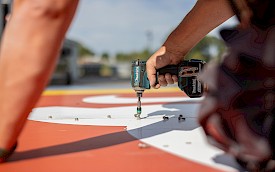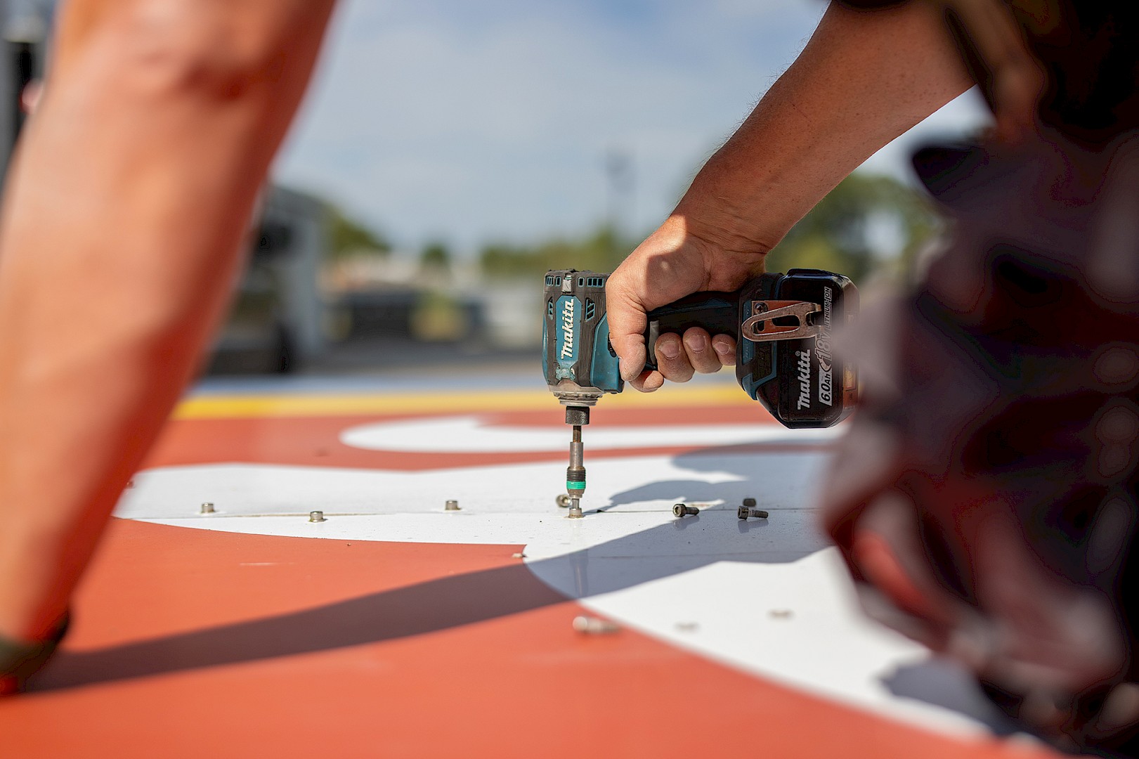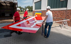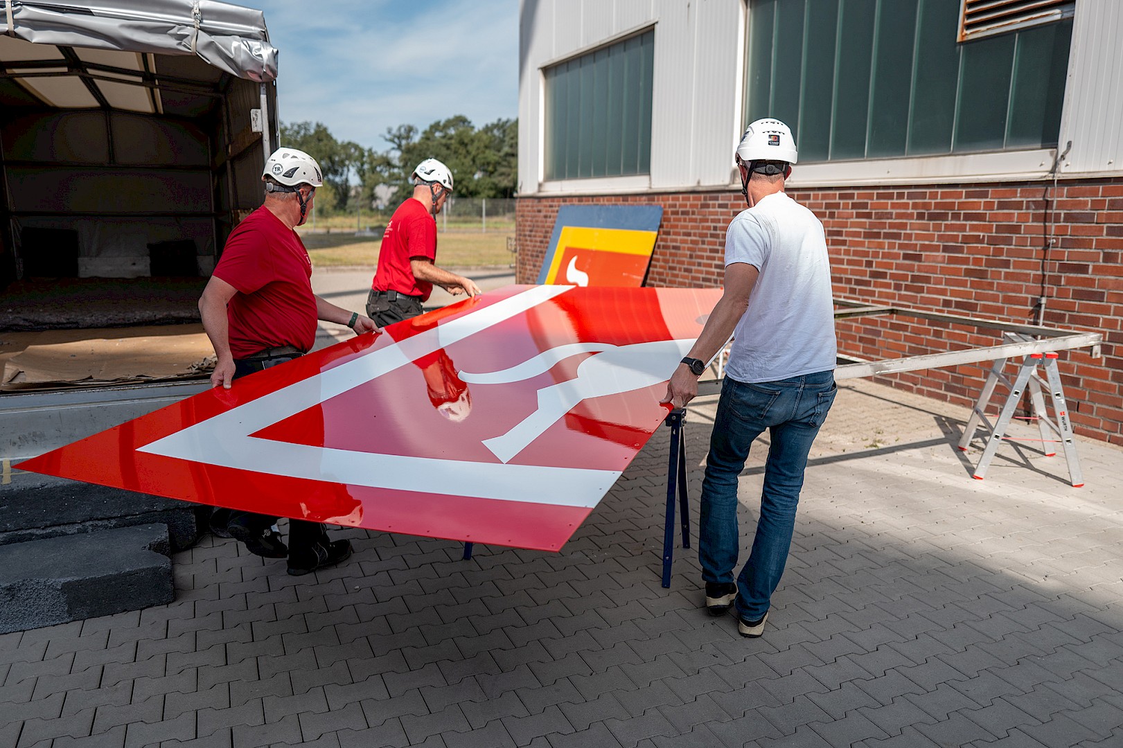 Dazu schraubten die Monteure die alten Logos samt Unterkonstruktionen erstmal ab – im Hubsteigerkorb auf 42 Metern Höhe! Am Boden tauschten die Brückinger die lackierten Bleche auf den Alurahmen aus und schon ging es wieder auf Riesenradhöhe!