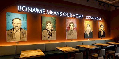 Auf dem Barspiegel findet sich ein besonderer Blickfang – das „Fire of Kawa“ – bei dessen Verkabelung Löcher für jeden einzelnen Letter durch das Glas gebohrt wurden. Der Schriftzug über den Porträts der Gründer besteht aus einzelnen Acryglasbuchstaben mit LED-Beleuchtung. Die Lichtanlagen installierte unser Team in Zeitlücken während des Umbauprozesses – alles in enger terminlicher Abstimmung mit dem Gastronomieplanungsbüro Soda.