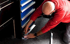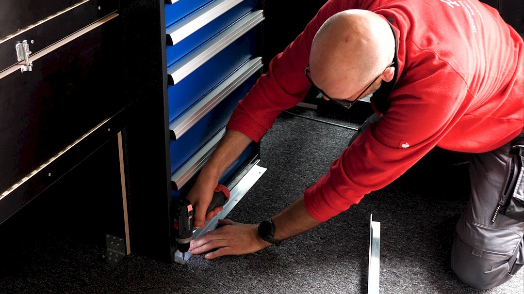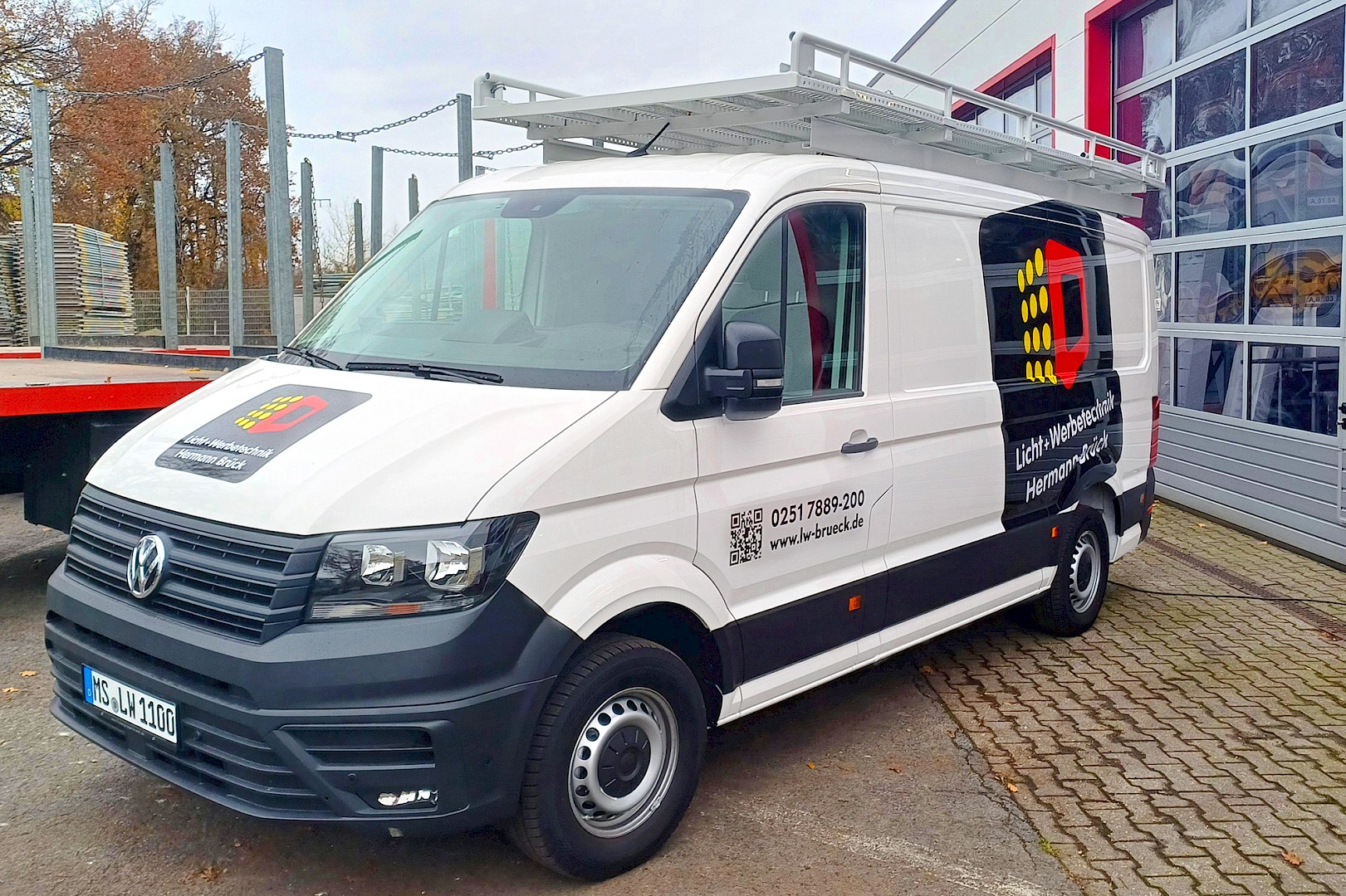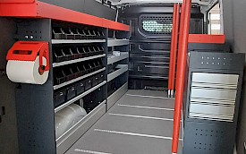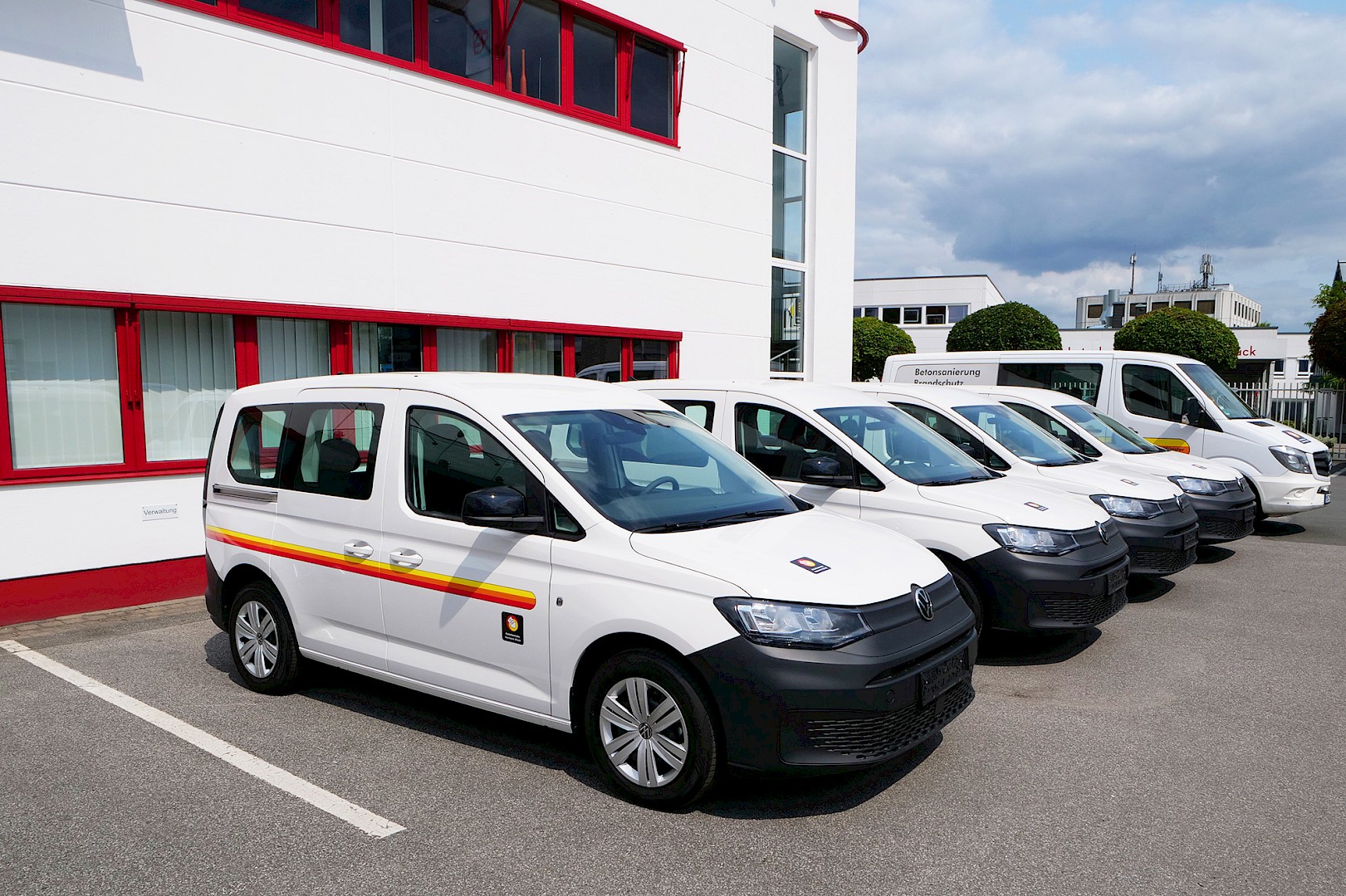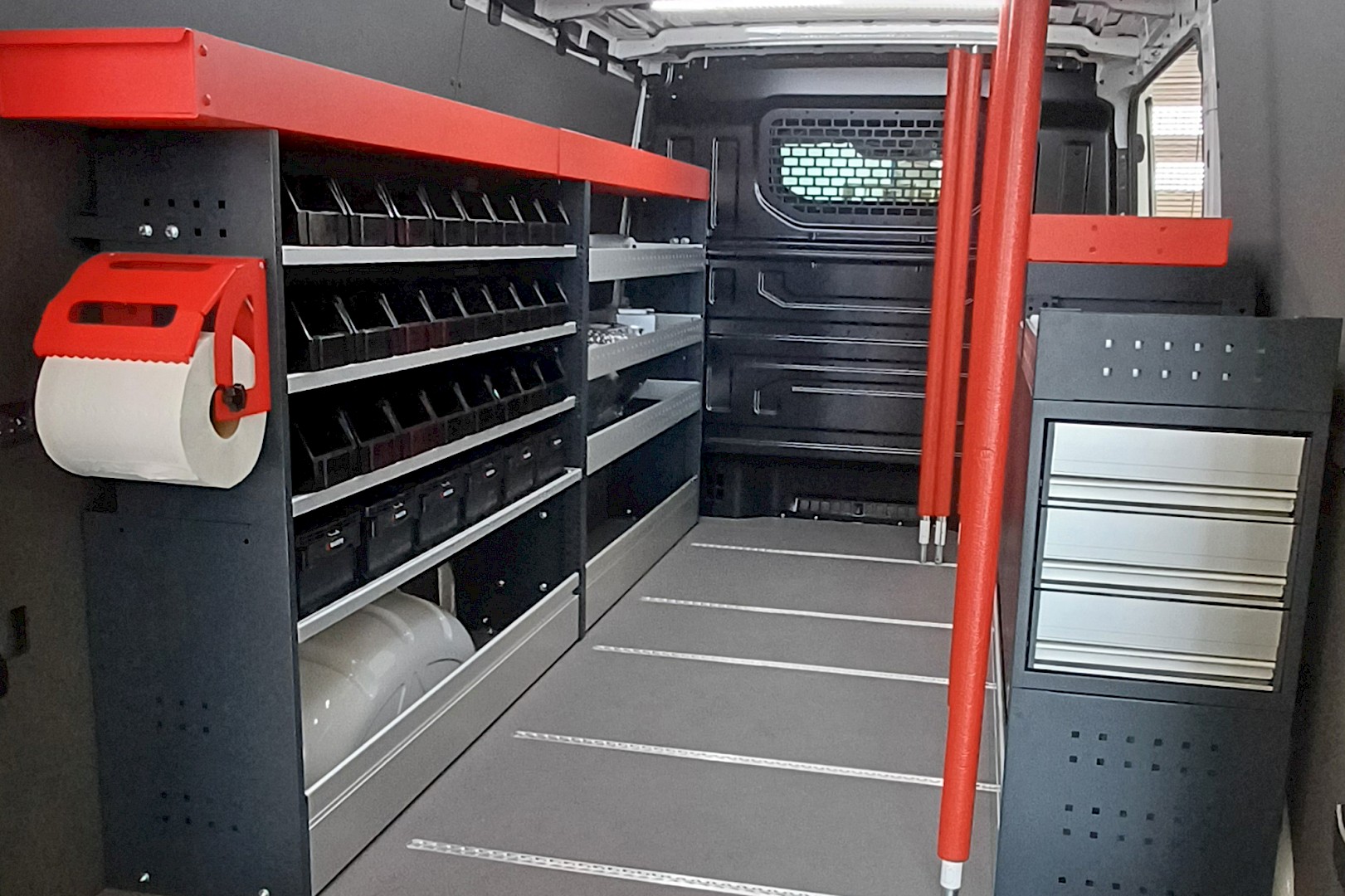 Die Anpassung der neuen Fahrzeuge erfolgte vollständig im eigenen Haus. Unsere Schilder- und Lichtreklamehersteller haben die Fahrzeugbeschriftung im firmeneigenen Design präzise und zügig umgesetzt. Im nächsten Schritt folgte der durchdachte Innenausbau mit maßgeschneiderten Stauraumlösungen für Werkzeuge, Maschinen und Materialien – perfekt abgestimmt auf die Anforderungen im täglichen Einsatz.