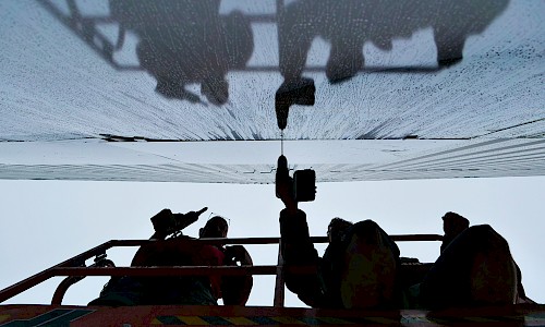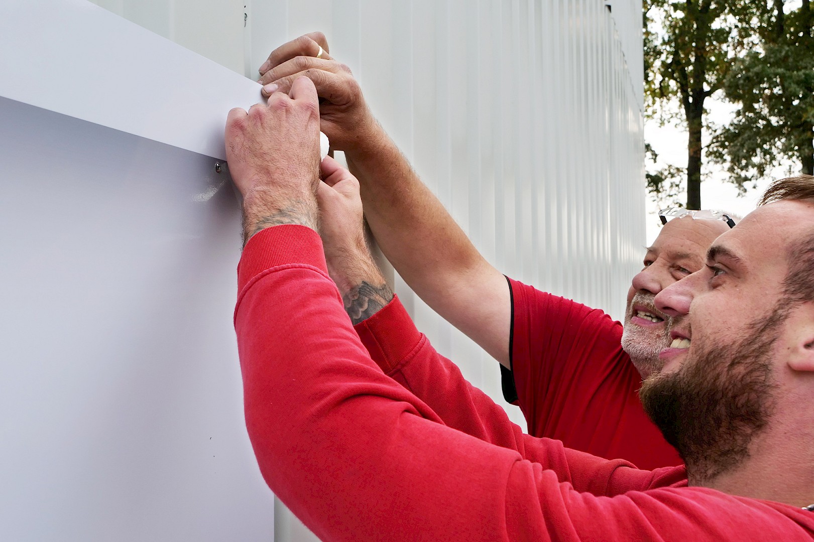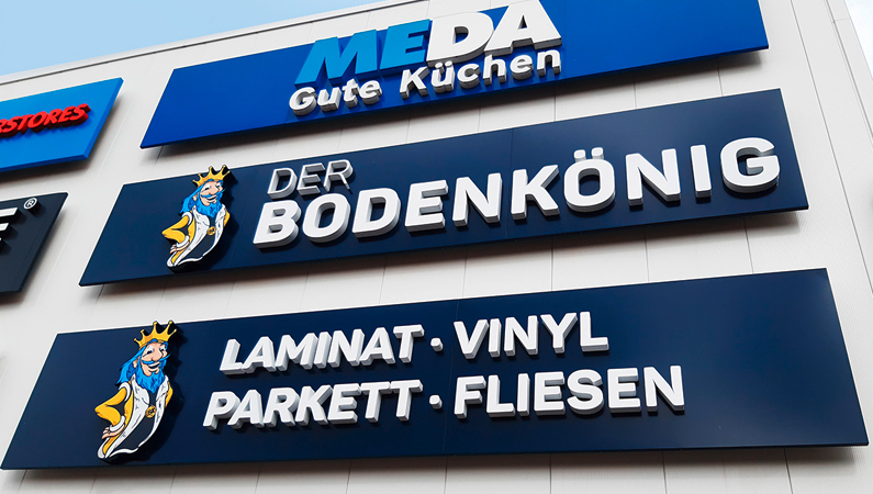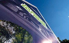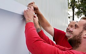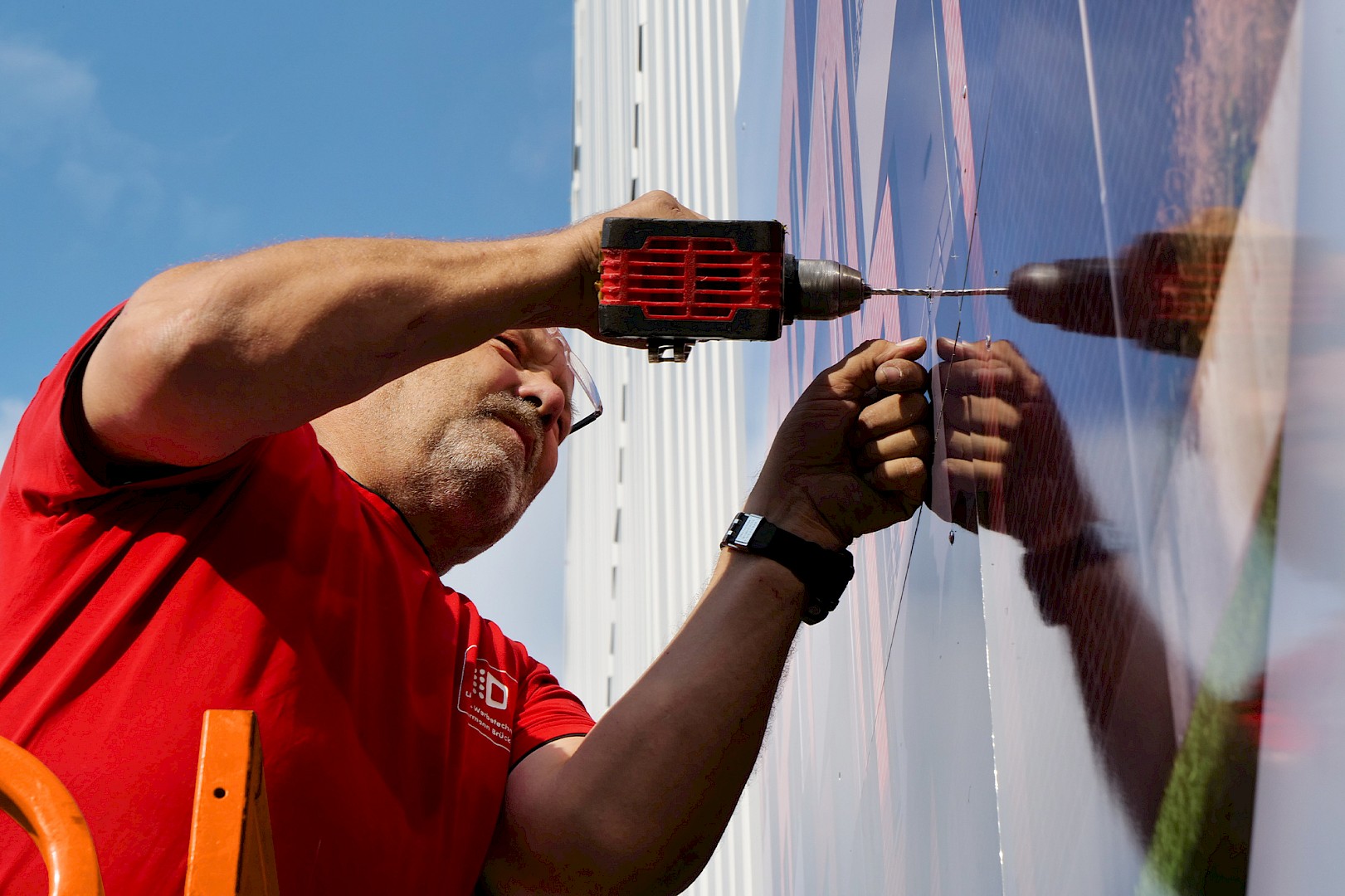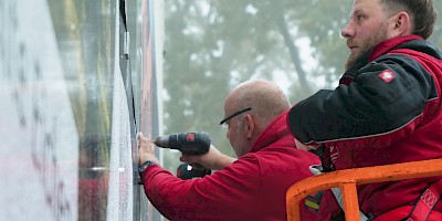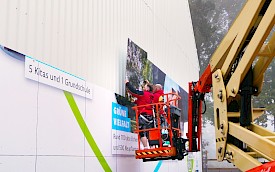 Das Wunschmotiv des Kunden, entworfen von der Agentur Kopfkunst, wurde an das Aufmaß angepasst und in über siebzig Ausschnitte fragmentiert. Die einzelnen Folien mussten akkurat auf die Trägerplatten aus Alu-Dibond aufgezogen und präzise bündig montiert werden, exakt Stoß an Stoß. Wegen der gerippten Fassadenoberfläche setzten die Brückinger jedes Bohrloch vor Ort an die passende Stelle. Zusammengefügt ergibt sich ein Wandbild auf 175 qm – ein echter Hingucker!