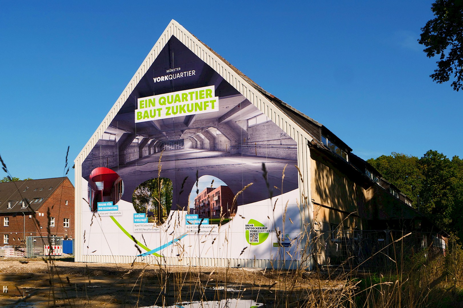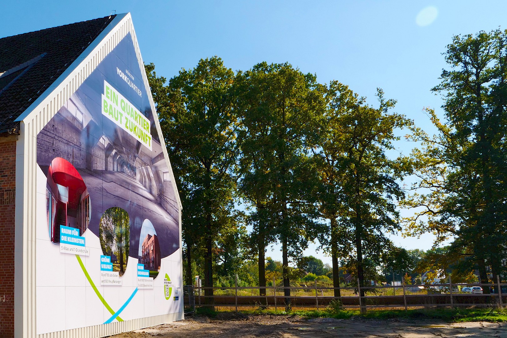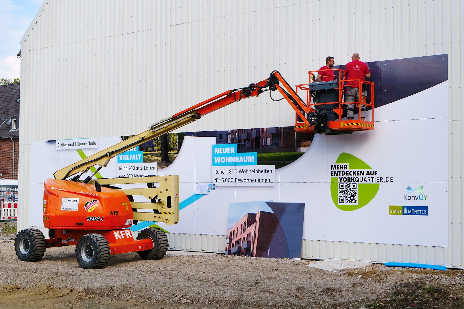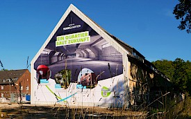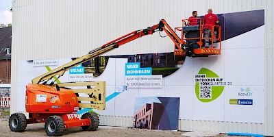 Auf dem York-Areal im Stadtteil Gremmendorf verkleidete das Team von L + W die komplette Giebelfront eines Backsteingebäudes, in dem früher die Kraftfahrzeughallen der britischen Armee untergebracht waren. Zu sehen ist ein Großbild, das die Entwicklung des neuen Wohnquartiers illustriert: