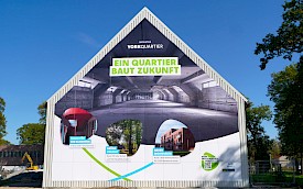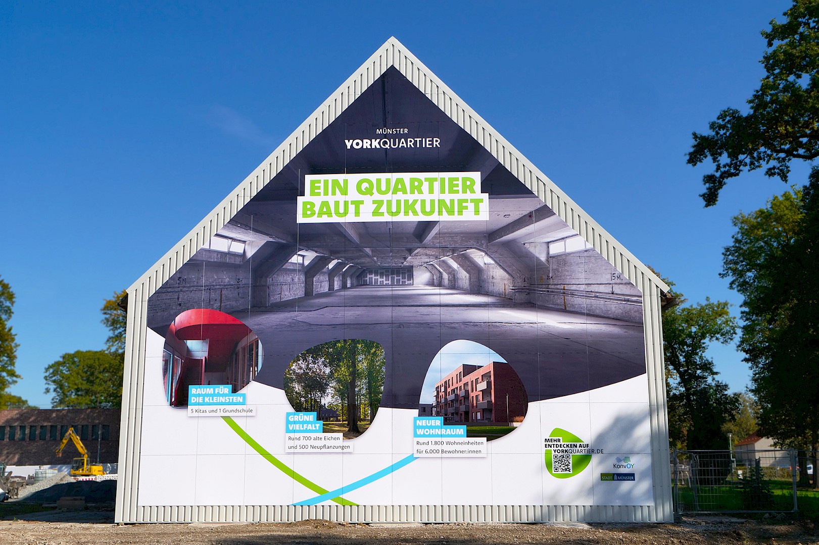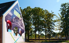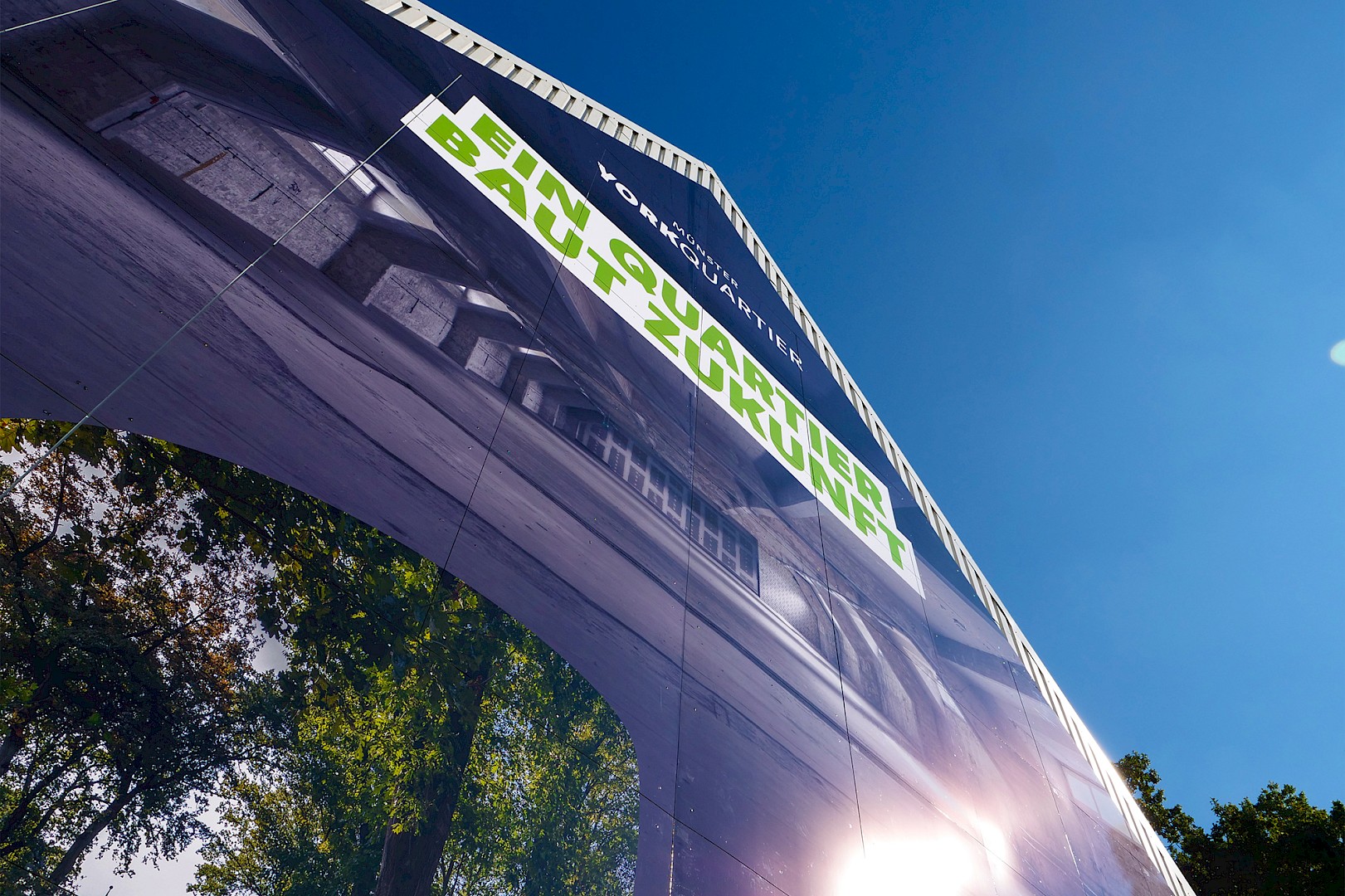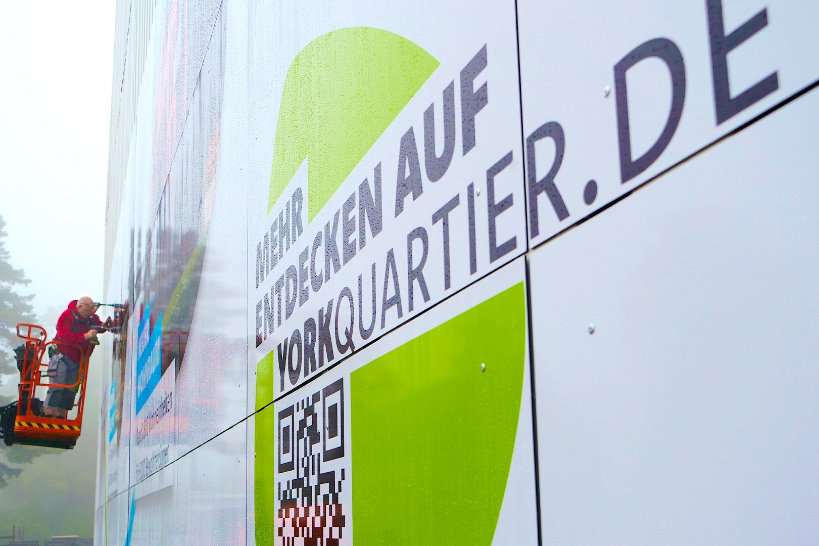 Auf dem York-Areal im Stadtteil Gremmendorf verkleidete das Team von L + W die komplette Giebelfront eines Backsteingebäudes, in dem früher die Kraftfahrzeughallen der britischen Armee untergebracht waren. Zu sehen ist ein Großbild, das die Entwicklung des neuen Wohnquartiers illustriert:
