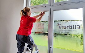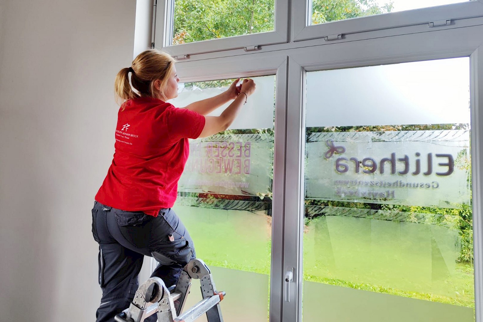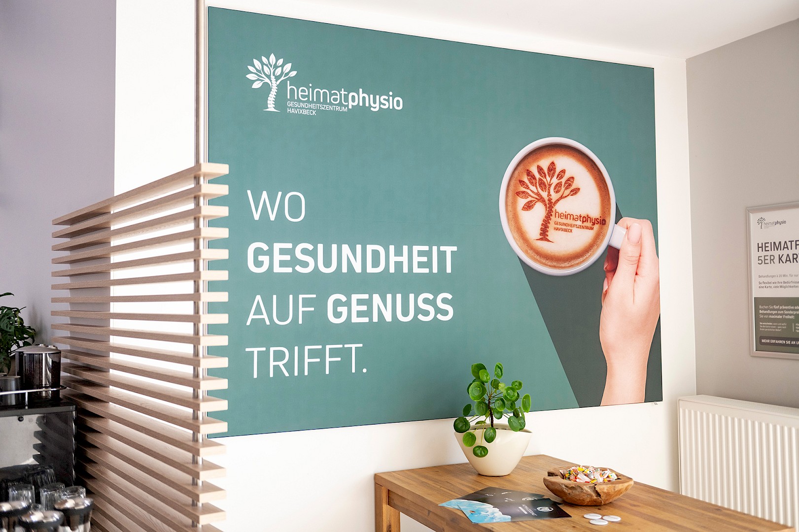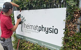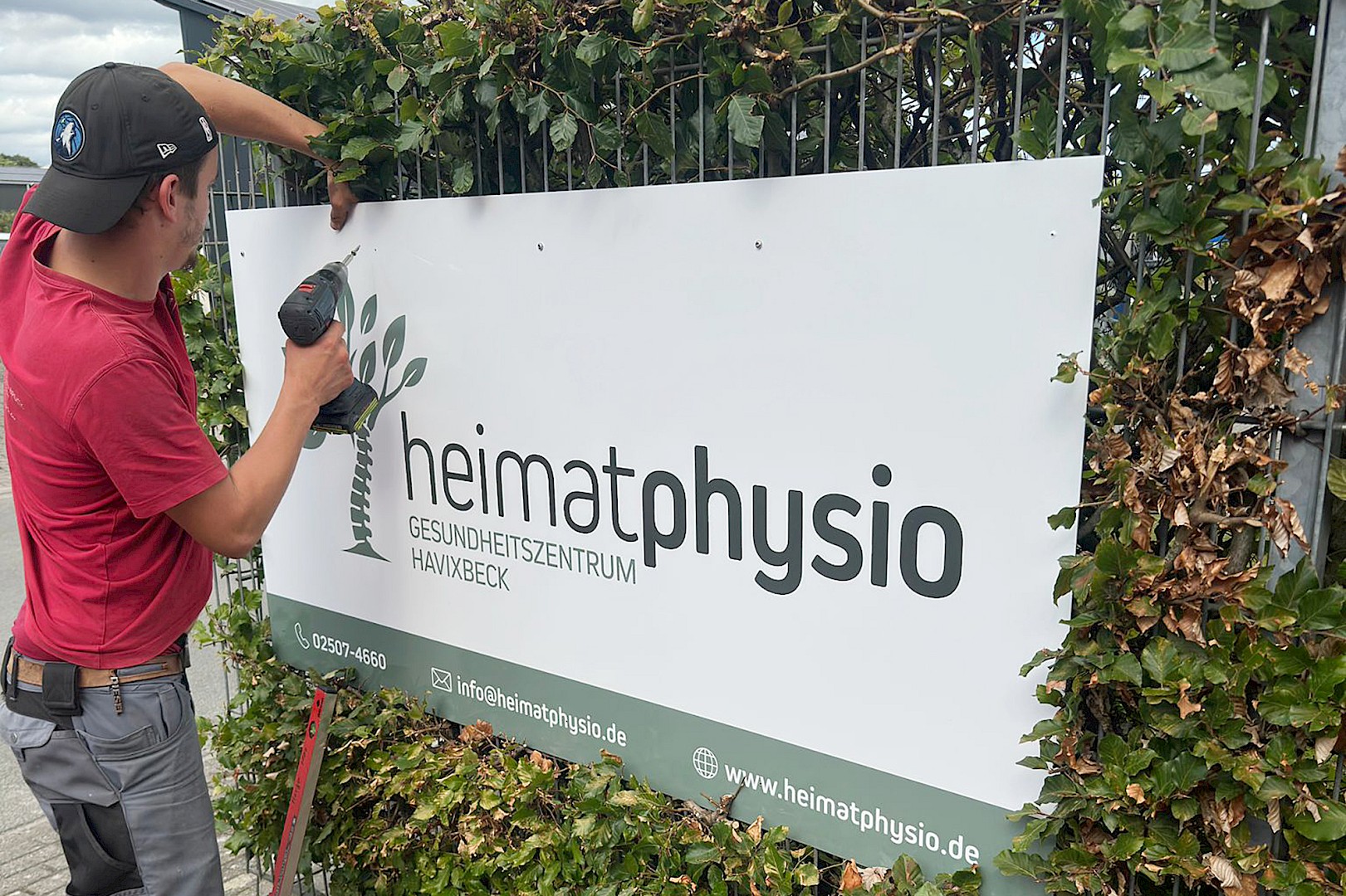 Auf Basis der Gestaltungsgrundlagen von Dreikon realisierten unsere Schilder- und Lichtreklamehersteller alle werbetechnischen Elemente – von Außenanlagen und Schildern bis zu verschiedenen Folierungen. Vor Ort in Havixbeck wurden die fertigen Elemente direkt montiert und sowohl Fenster- als auch Innenbereiche foliert. Das Ergebnis: ein moderner Auftritt und echte Wohlfühlatmosphäre für heimatphysio.