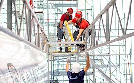 Wie verankert man ein Baugerüst in einer Glasfront? Diese und weitere Fragen lösten die Brückinger bei der Einrüstung des denkmalgeschützten Iduna-Pavillons in Münsters…