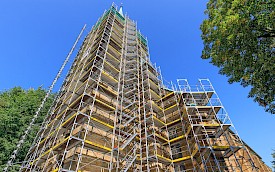 Am Gerüst fest verankerte Treppentürme machen die Arbeit sicherer, bequemer und zügiger. Auch als Fluchtwege sind sie hilfreich. Wir bauen Treppentürme für Handwerker, Mitarbeiter und Kunden – auf Wunsch voll verkapselt gegen Schmutz und Witterung und sogar mit Teppichboden ausgestattet.